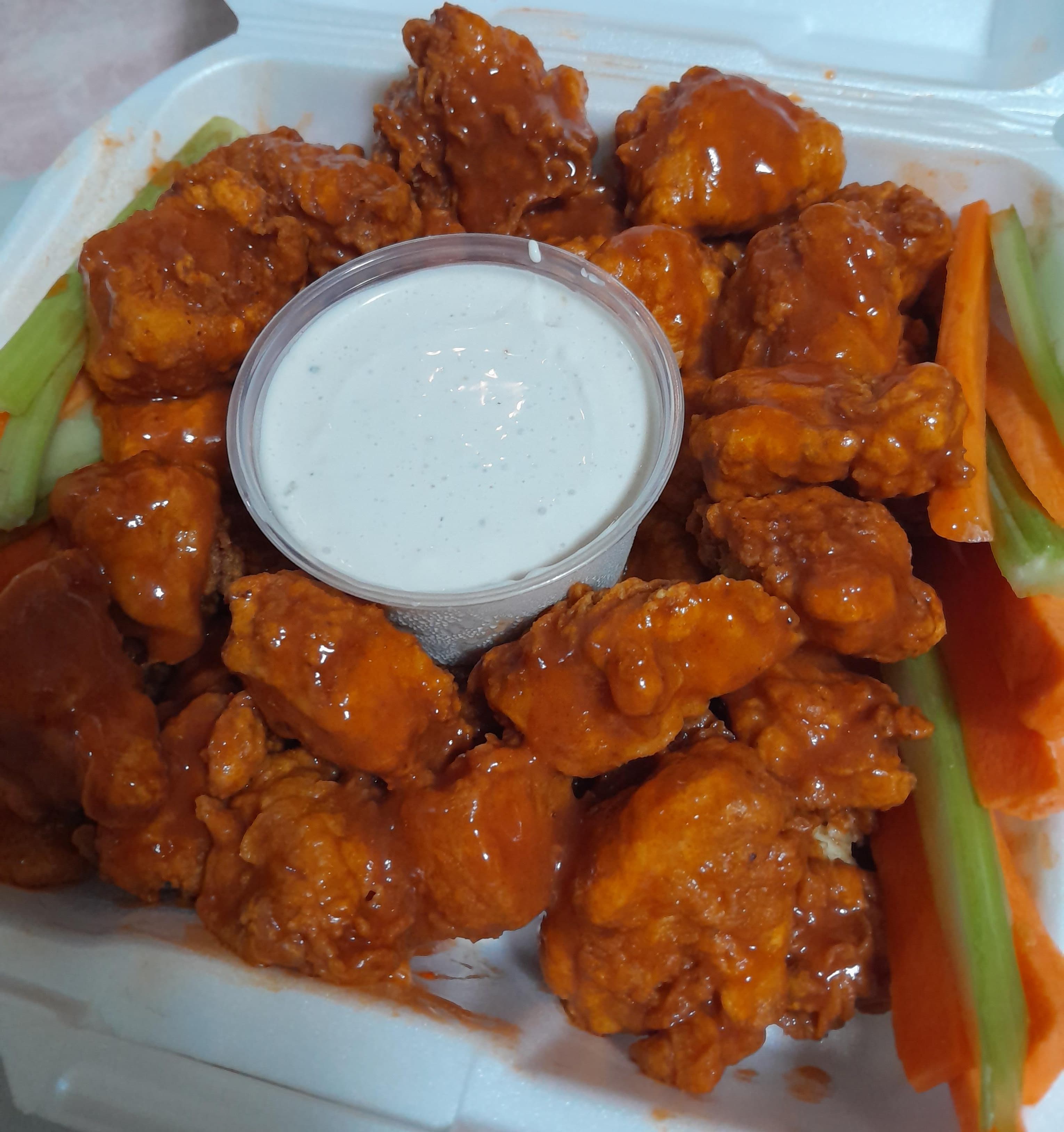 Boneles bufalo,BBQ o mango habanero acompañados con 2 taquitos chunkun,rellenos de queso filadelfia,camaron,cebollin frito y aderezo chipotle