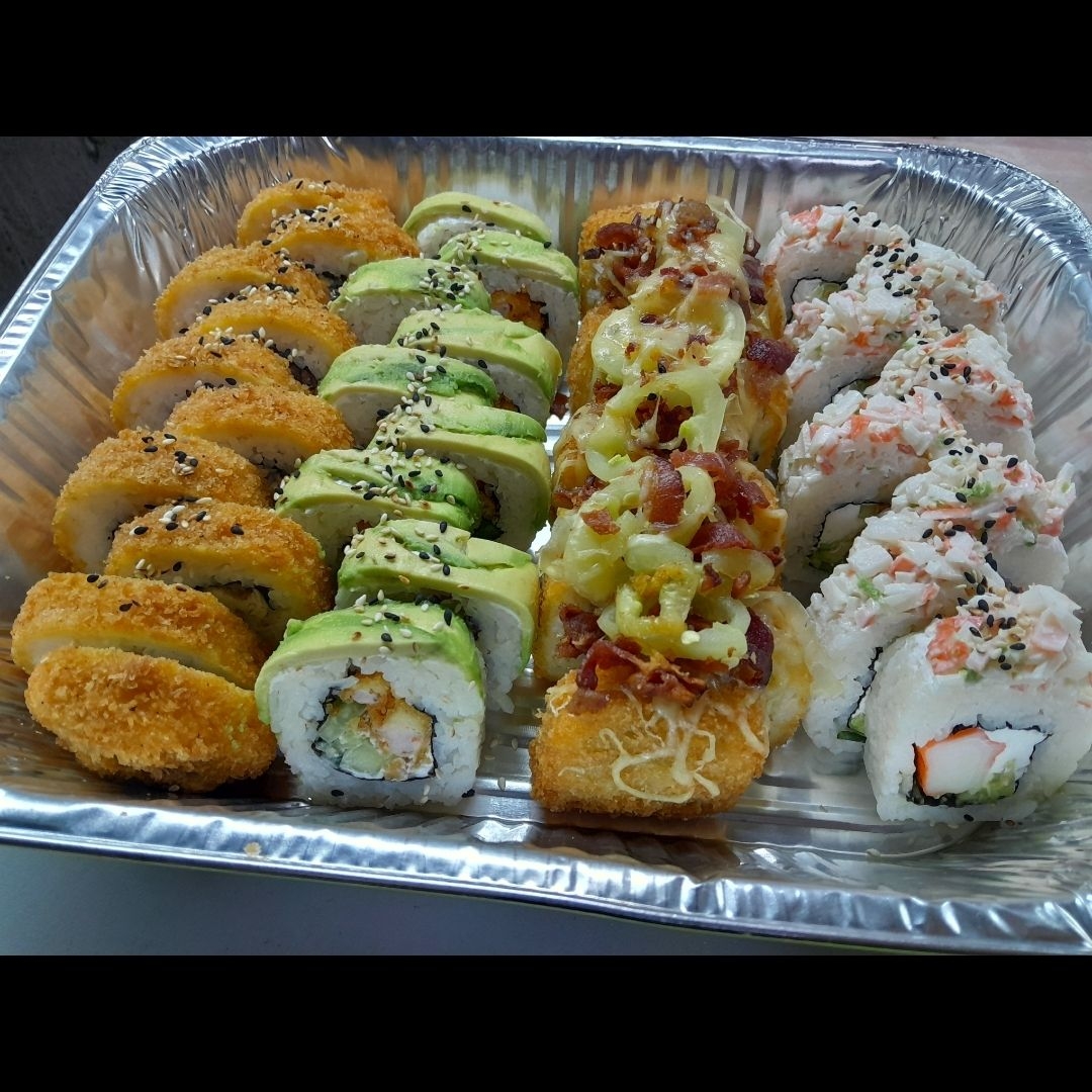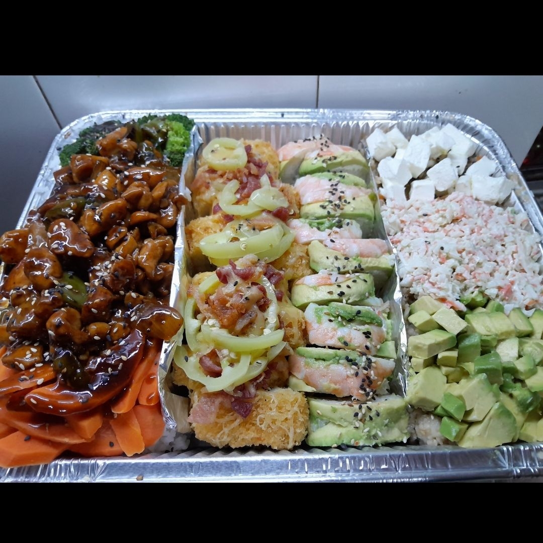 Para 4 a 5 personas dos rollos los que gusten elegir mas teriyaki y yakimeshi special o yakidon,arroz cantones o boneless armenla a su gustó!
