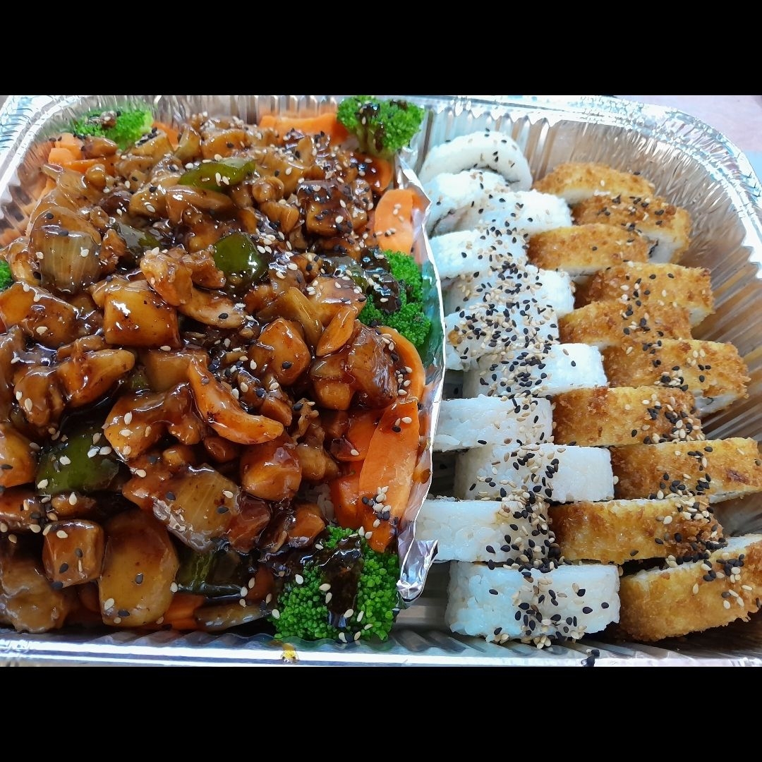 Teriyaki de pollo mas un rollo cielo mar y tierra empanizado y un kany roll fresco para 4 a 5 personas