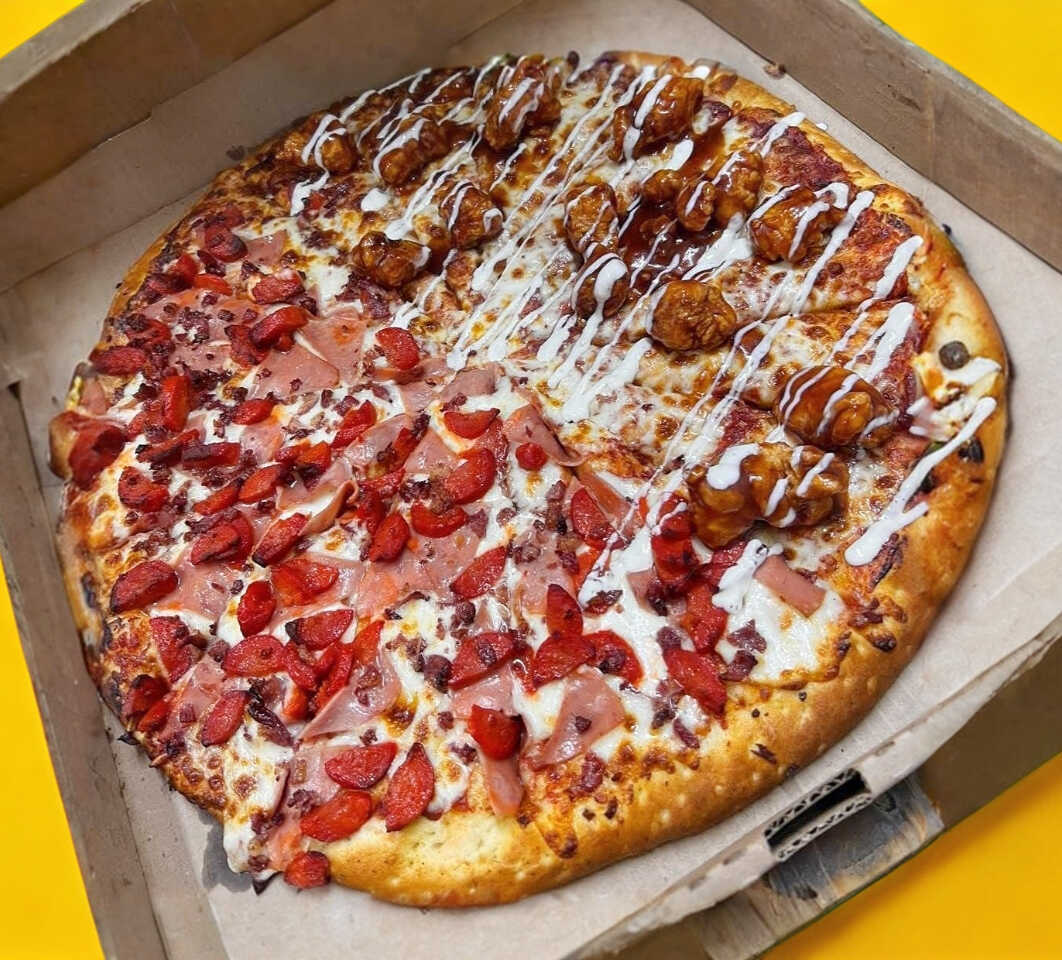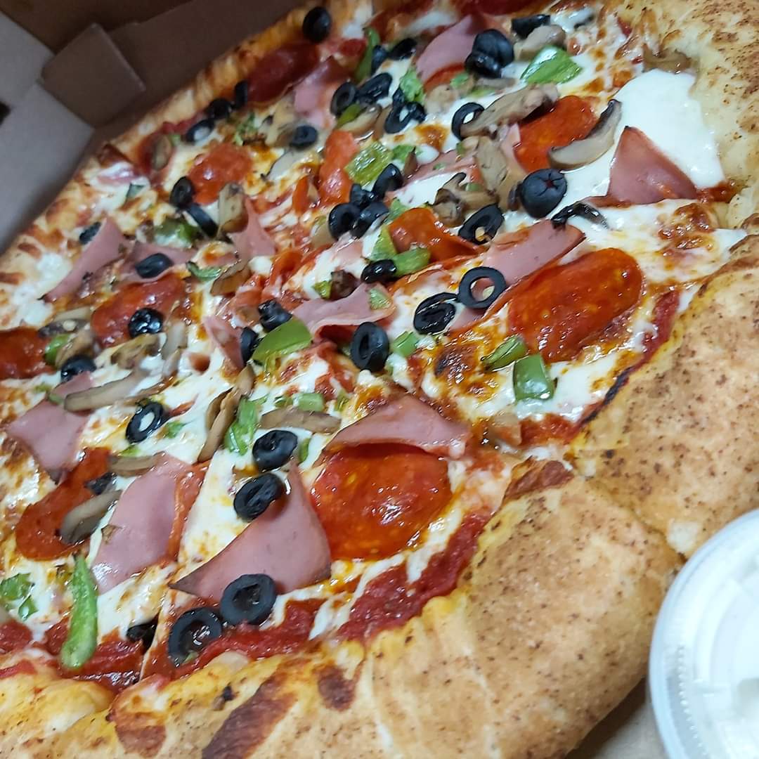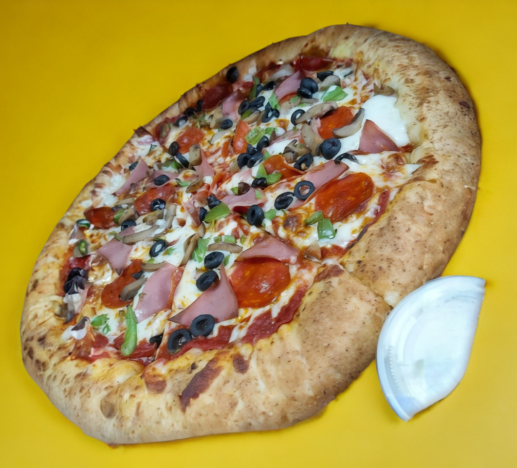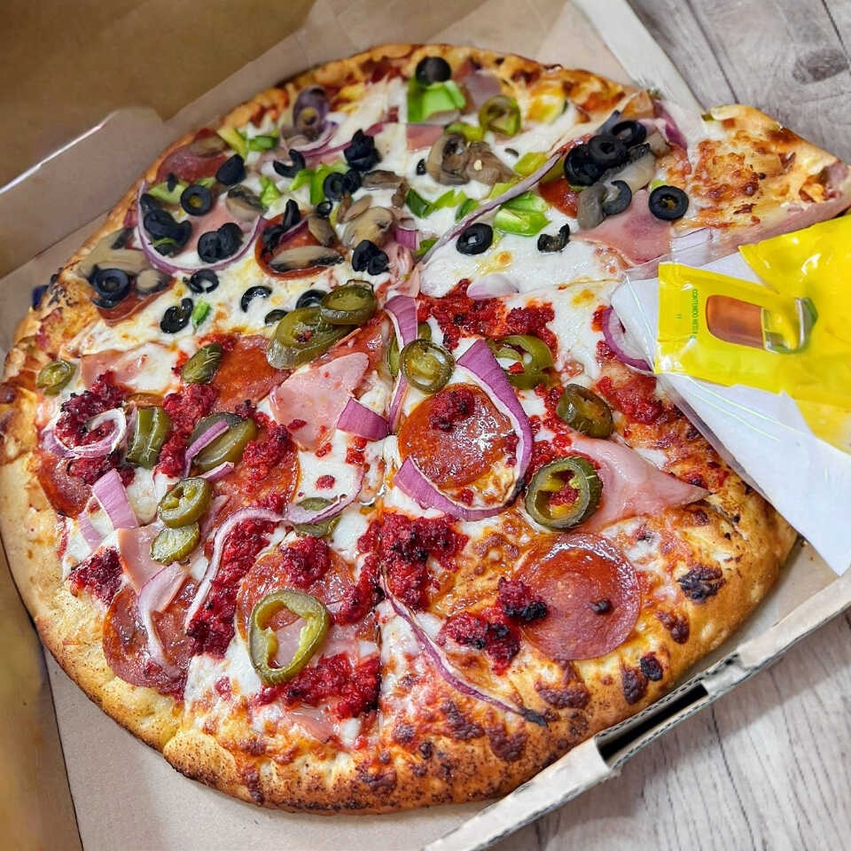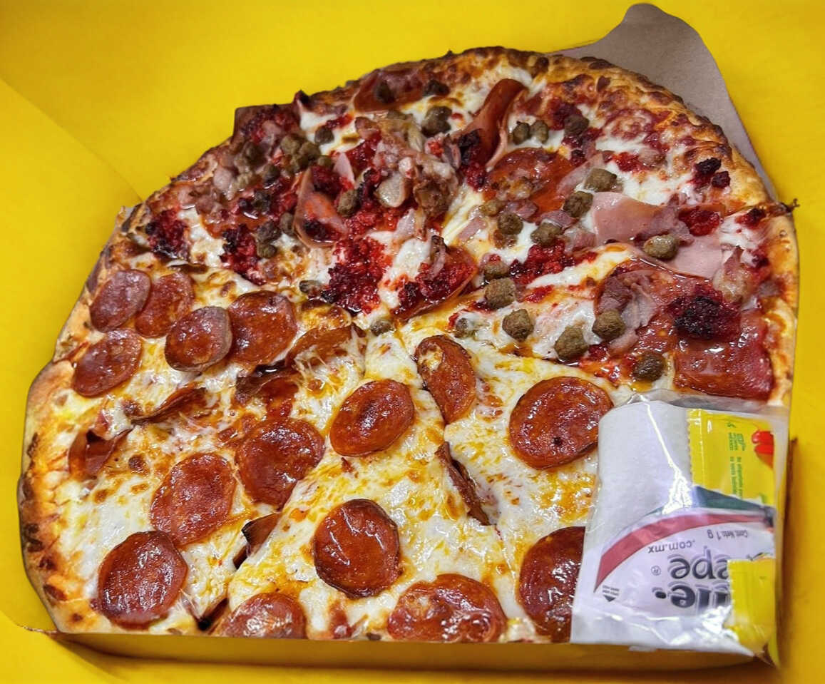 Peperoni más jamón, más champiñones, más cebolla, más chile morrón y aceituna.