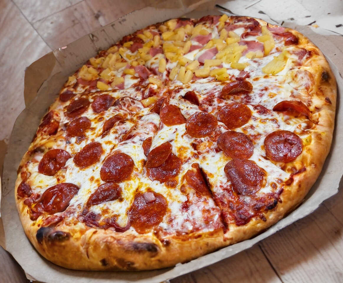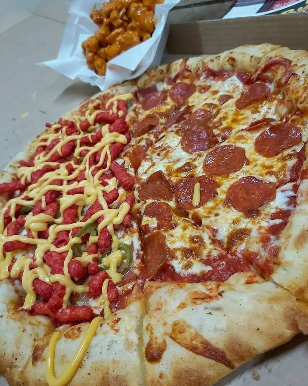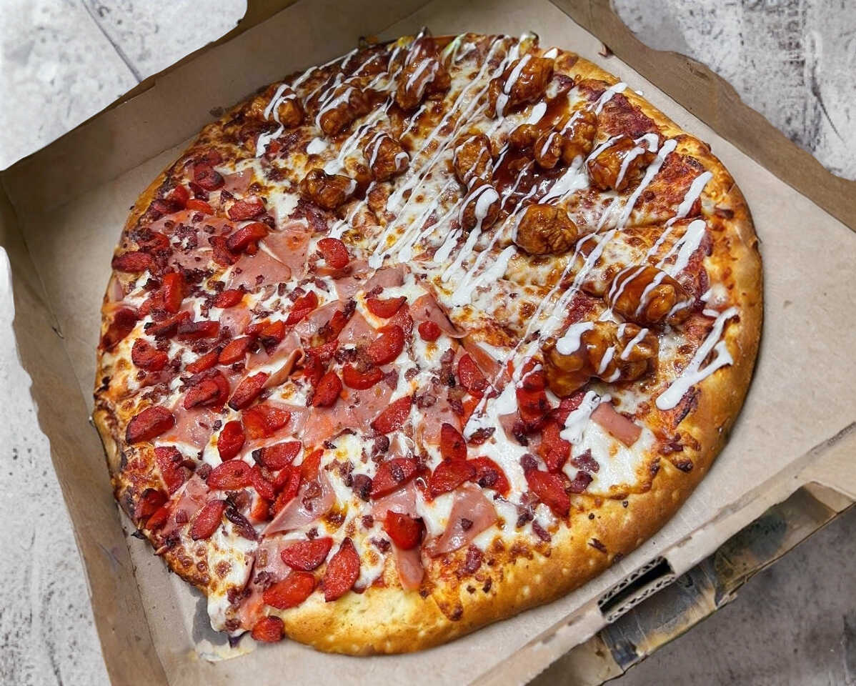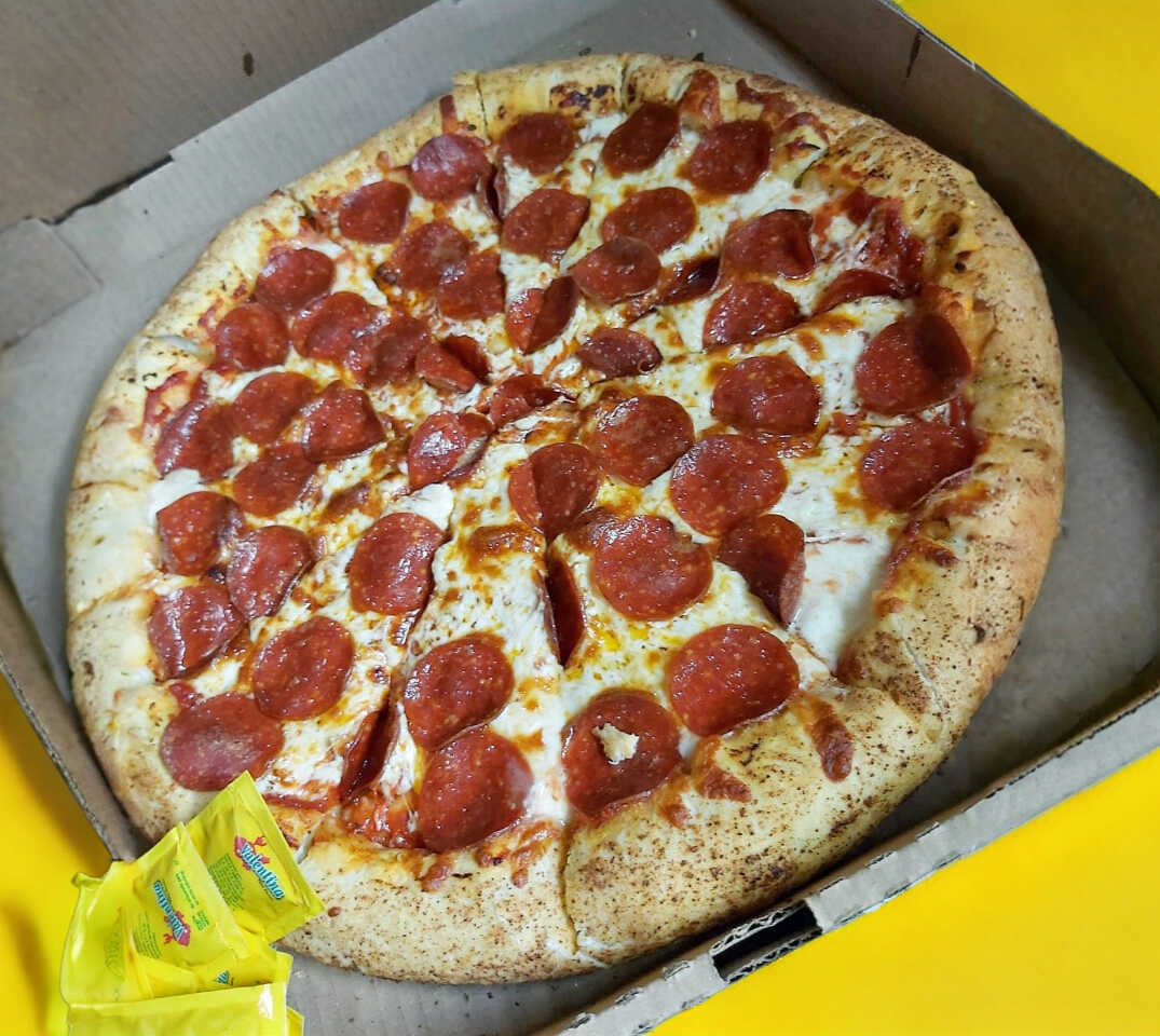 Peperoni más jamón, más champiñones, más cebolla, más chile morrón y aceituna.