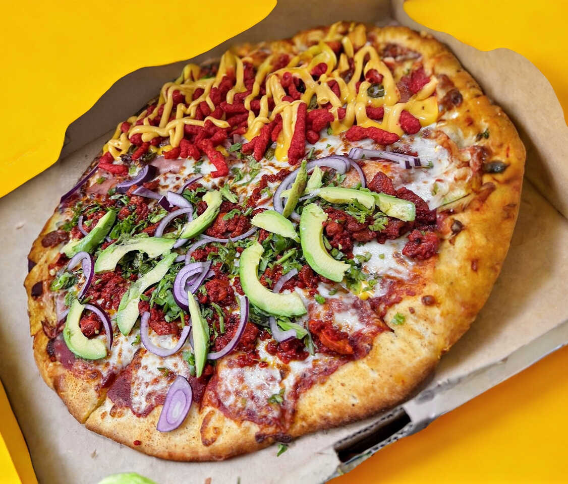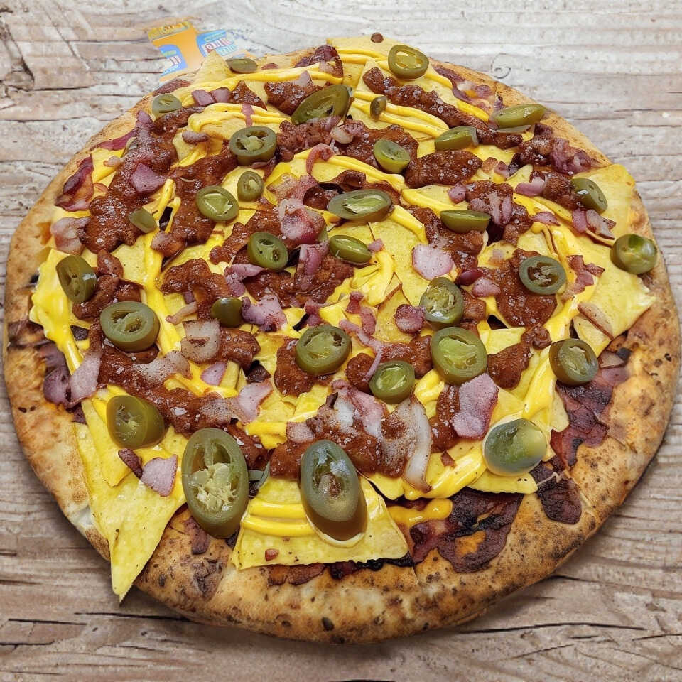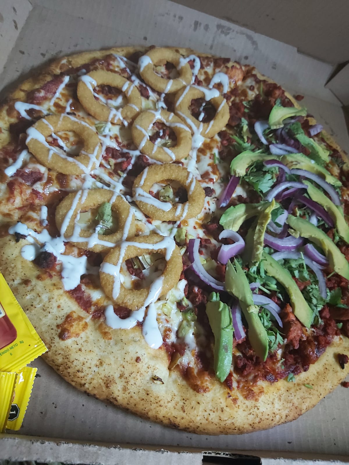 Jamón, chile werito, chorizo, cebolla cambray y aros de cebolla.
