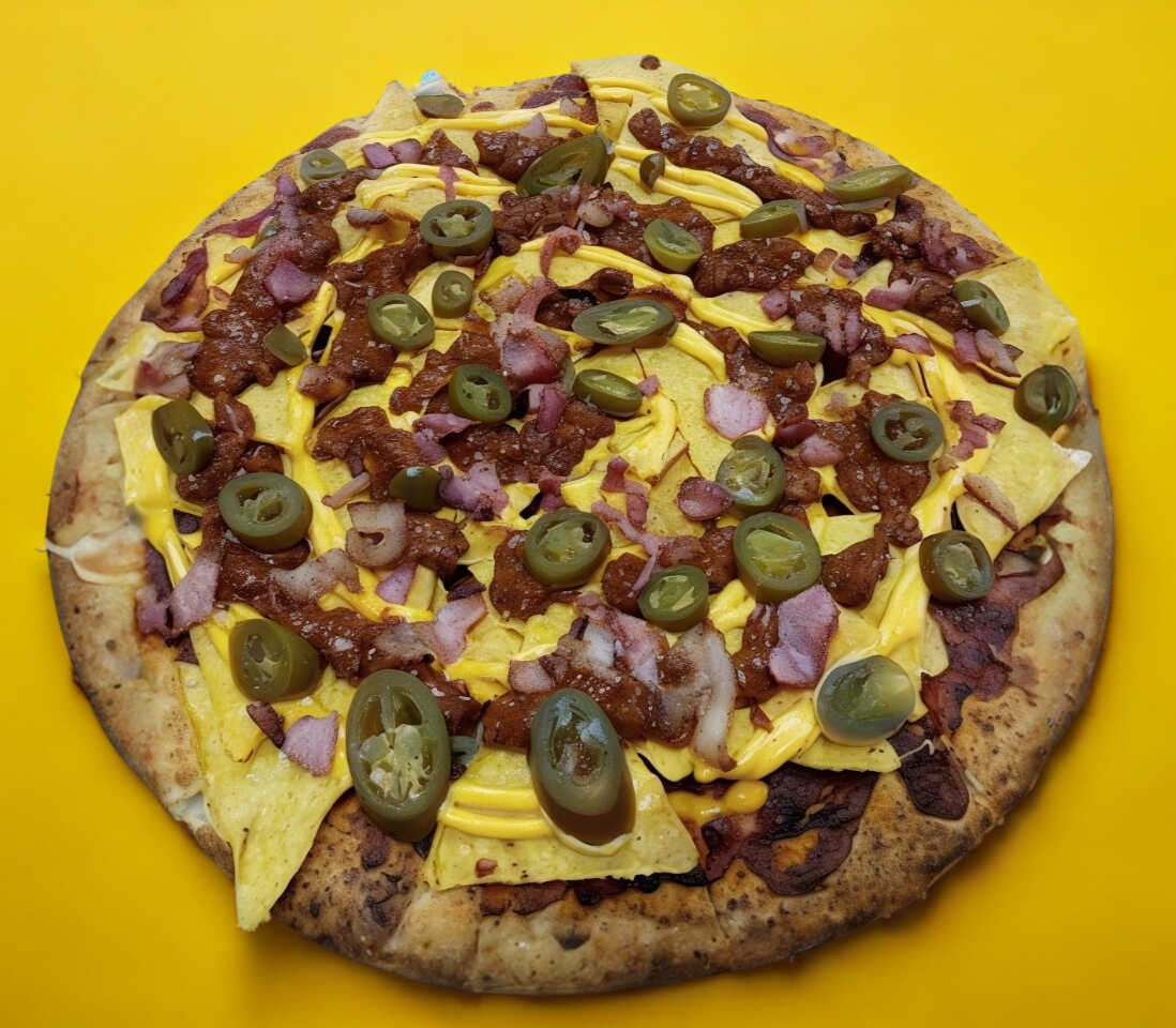 Totopos, chile jalapeño, queso para nachos, más tocino y chili beans.