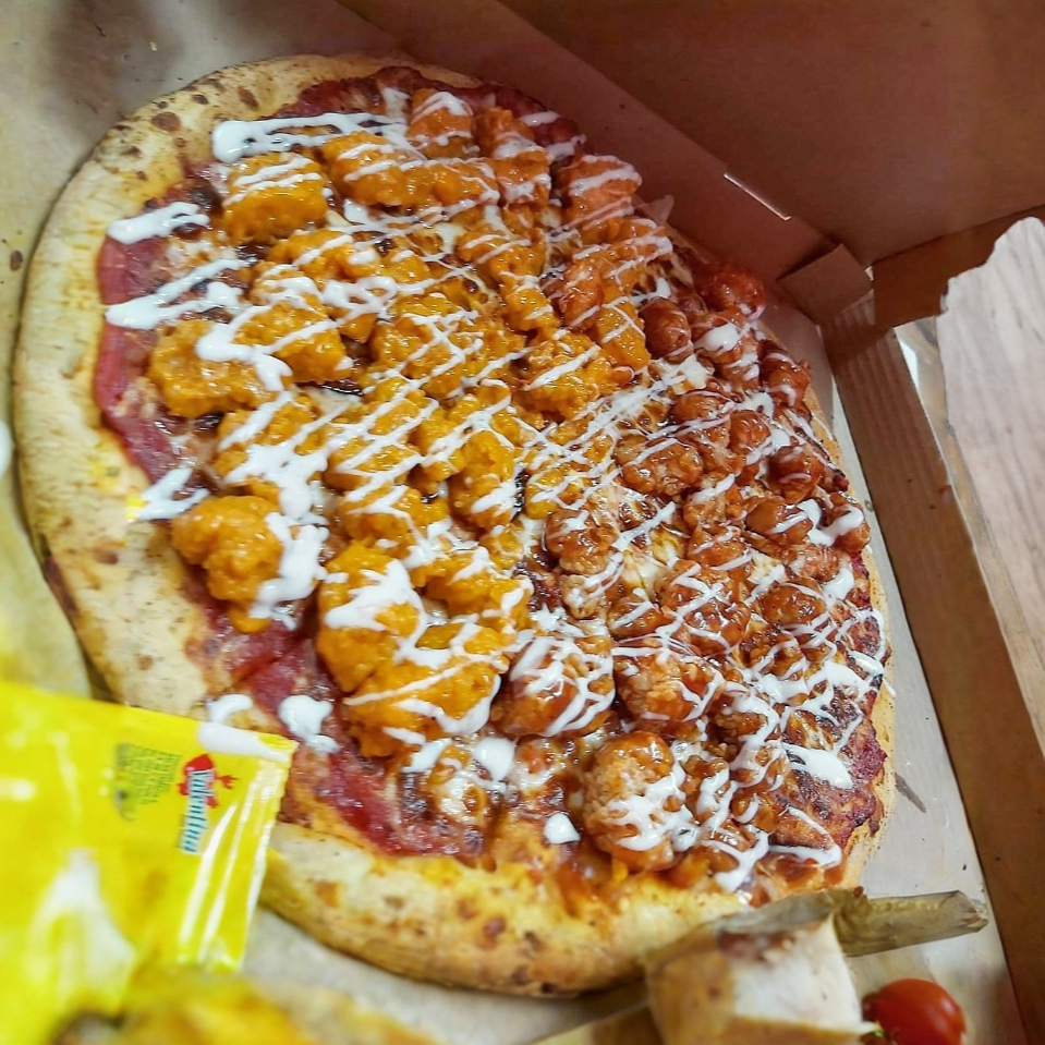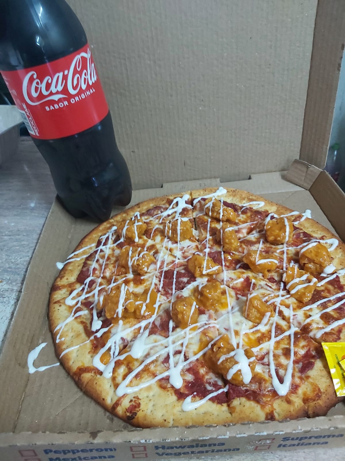 Queso mozzarella , pechuga de pollo (personal 100gr, mediana 200gr), salsa BBQ o Buffalo + Ranch