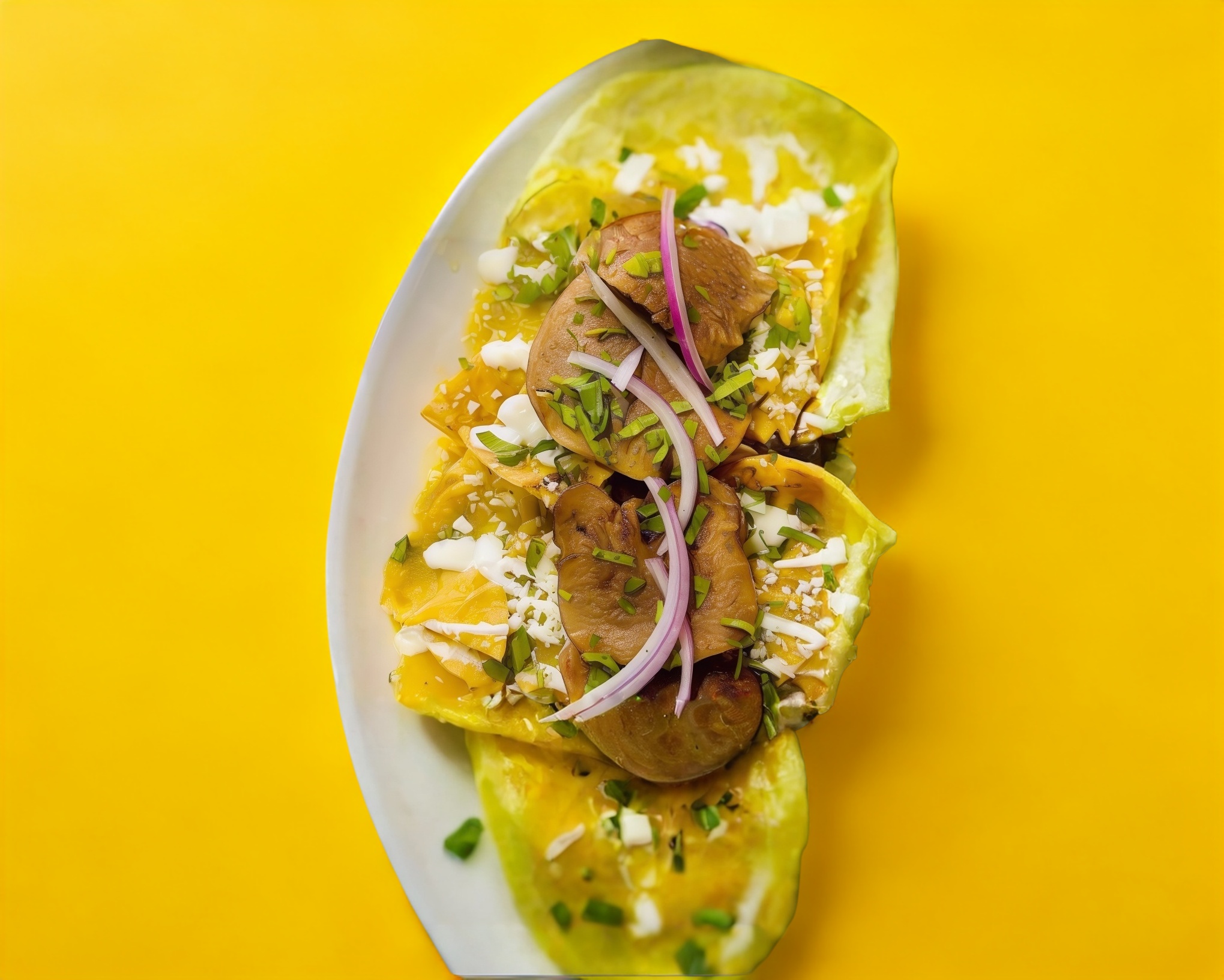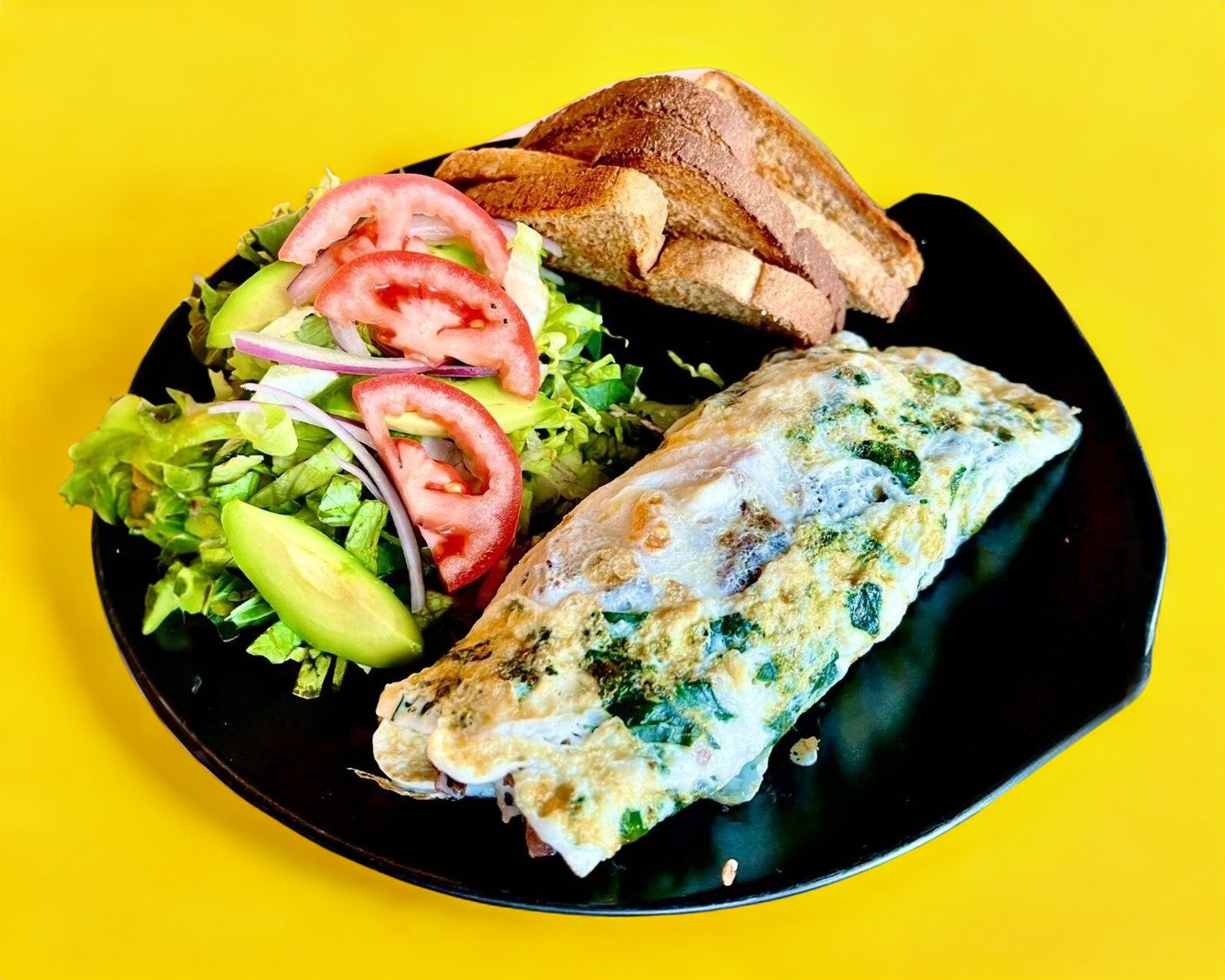 Hecho a base de claras de huevo, relleno de queso fresco, espinaca, champiñon y acompañado con ensalada verde.