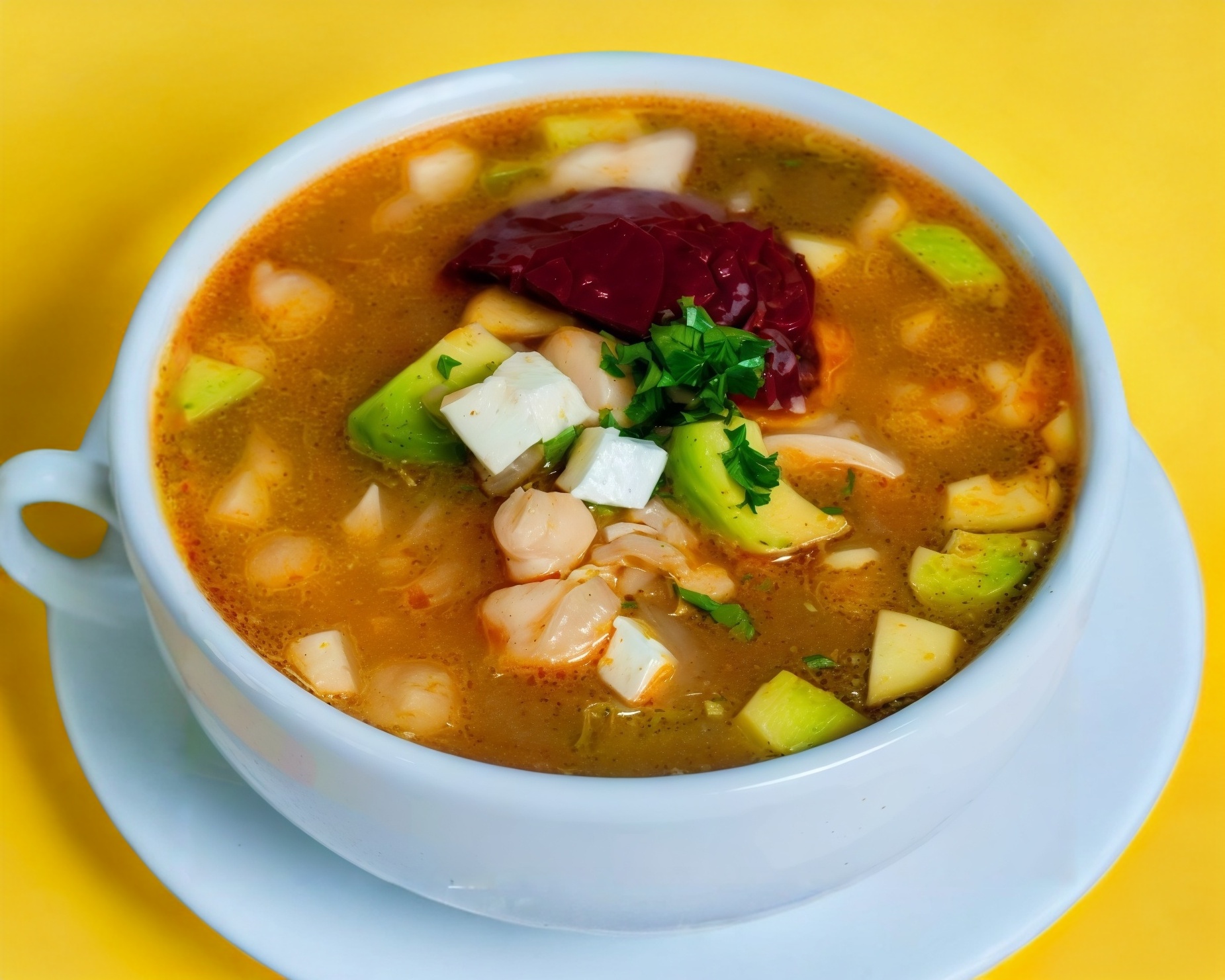 Delicioso caldo de pechuga deshebrada (calabaza, zanahoria, papa, aguacate y queso fresco) incluye tortillas de maíz.
