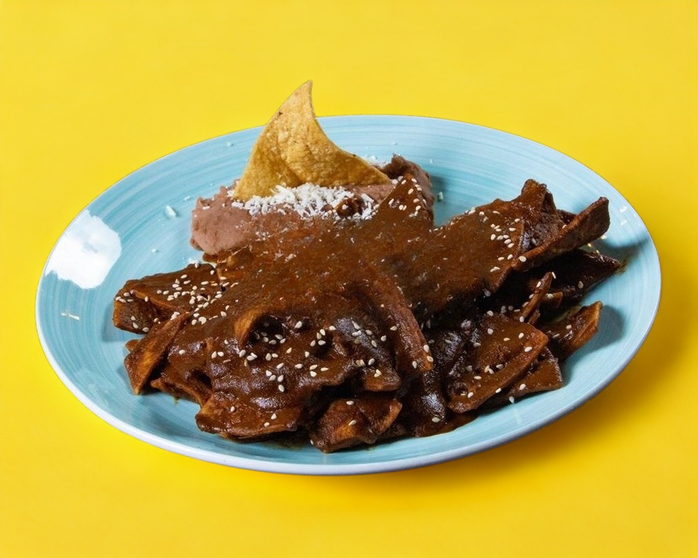 Chilaquiles con mole preparados con ajonjolí, cebolla morada, cilantro y aguacate, incluye bebida.