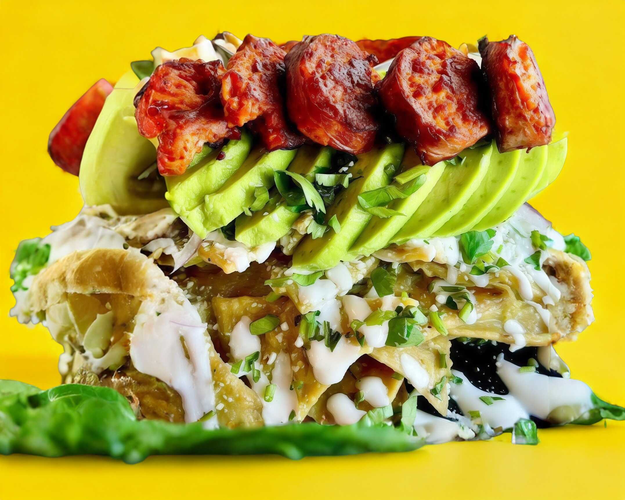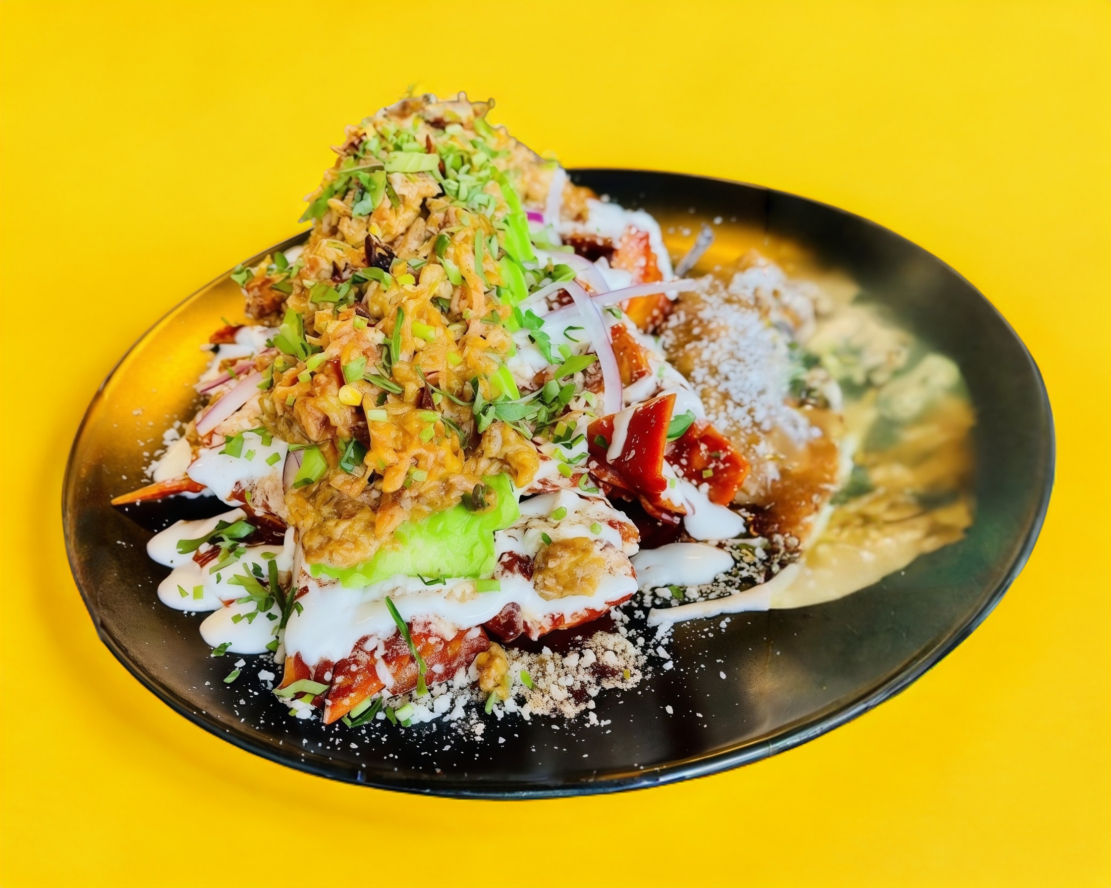 Chilaquiles bañados en una salsa roja de birria, decorados con cebolla morada, cilantro, aguacate, queso y crema.