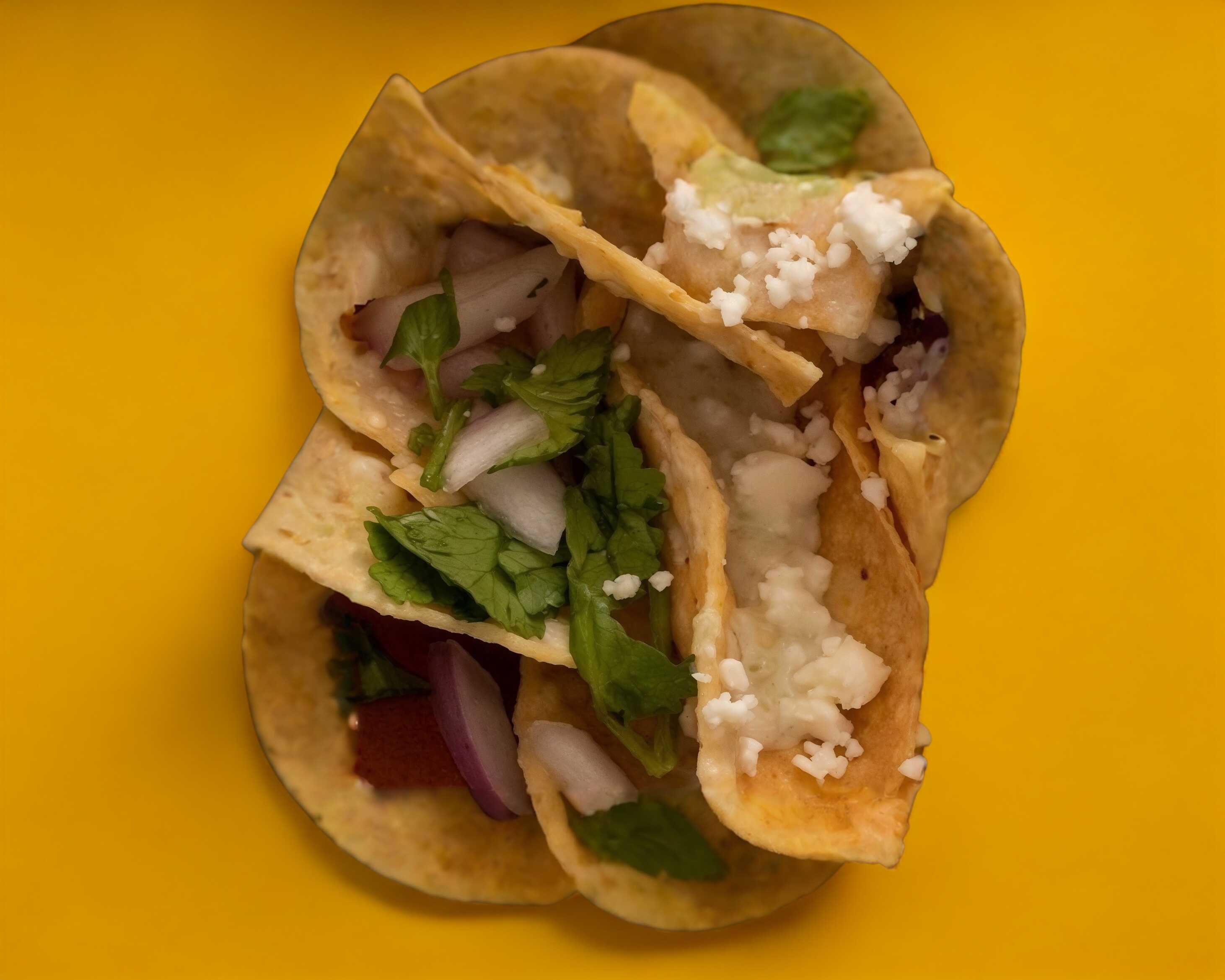 Elige tu salsa, con barbacoa de la casa, acompañados con rábano, aguacate, cebolla morada y cilantro, frijoles refritos. Preparados con queso y crema.