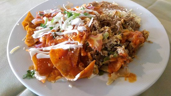 Deliciosos chilaquiles con nuestra tradicional salsa roja, acompañados de machaca a la mexicana, frijoles, papa sazonada y huevo estrellado, preparados con cebolla morada, cilantro, crema y queso.