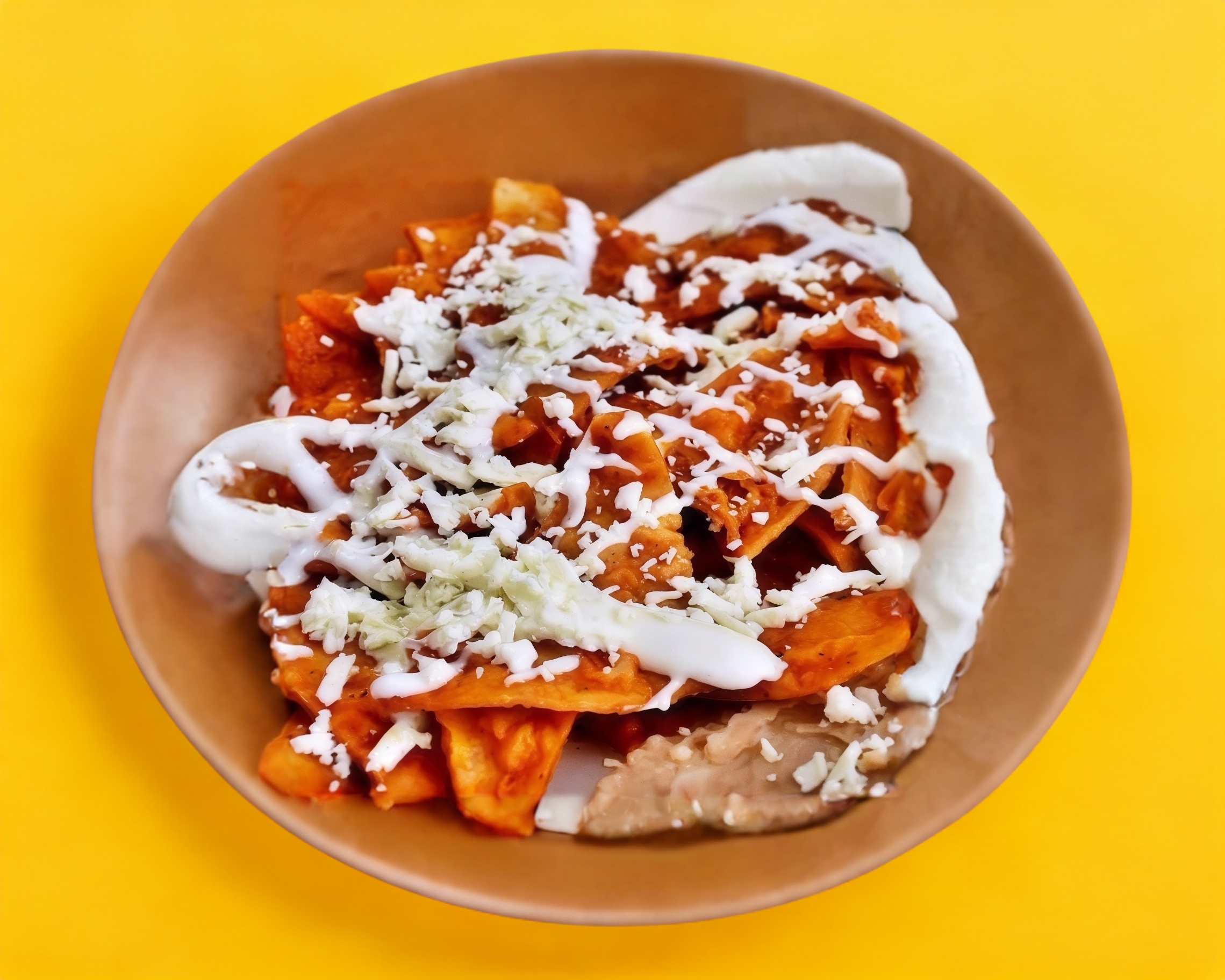 Bowl de Chilaquiles, salsa y proteína a elegir (con costo), preparados con cebolla morada, cilantro, queso cotija y crema. Platillo personal (Foam plástico de 1 L)