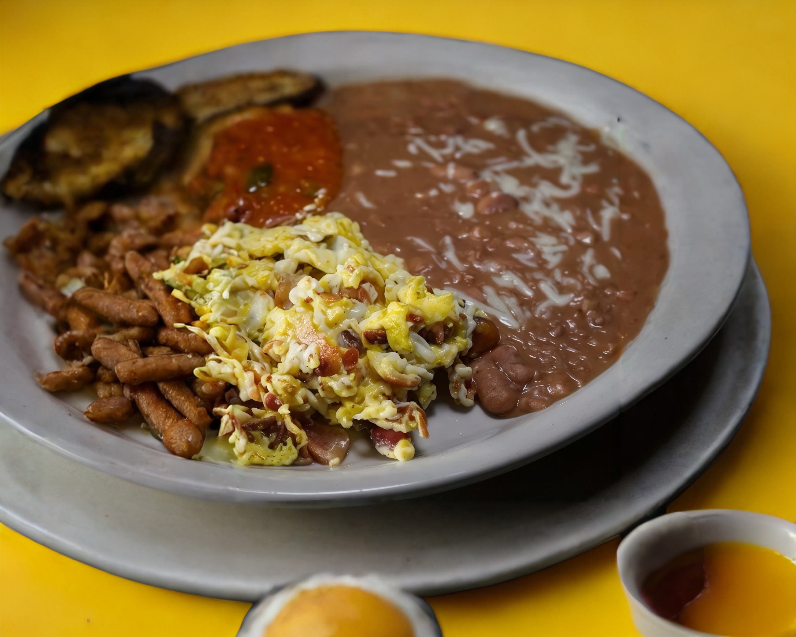 Dos huevos revueltos con tocino y frijoles refritos tortilla de maiz