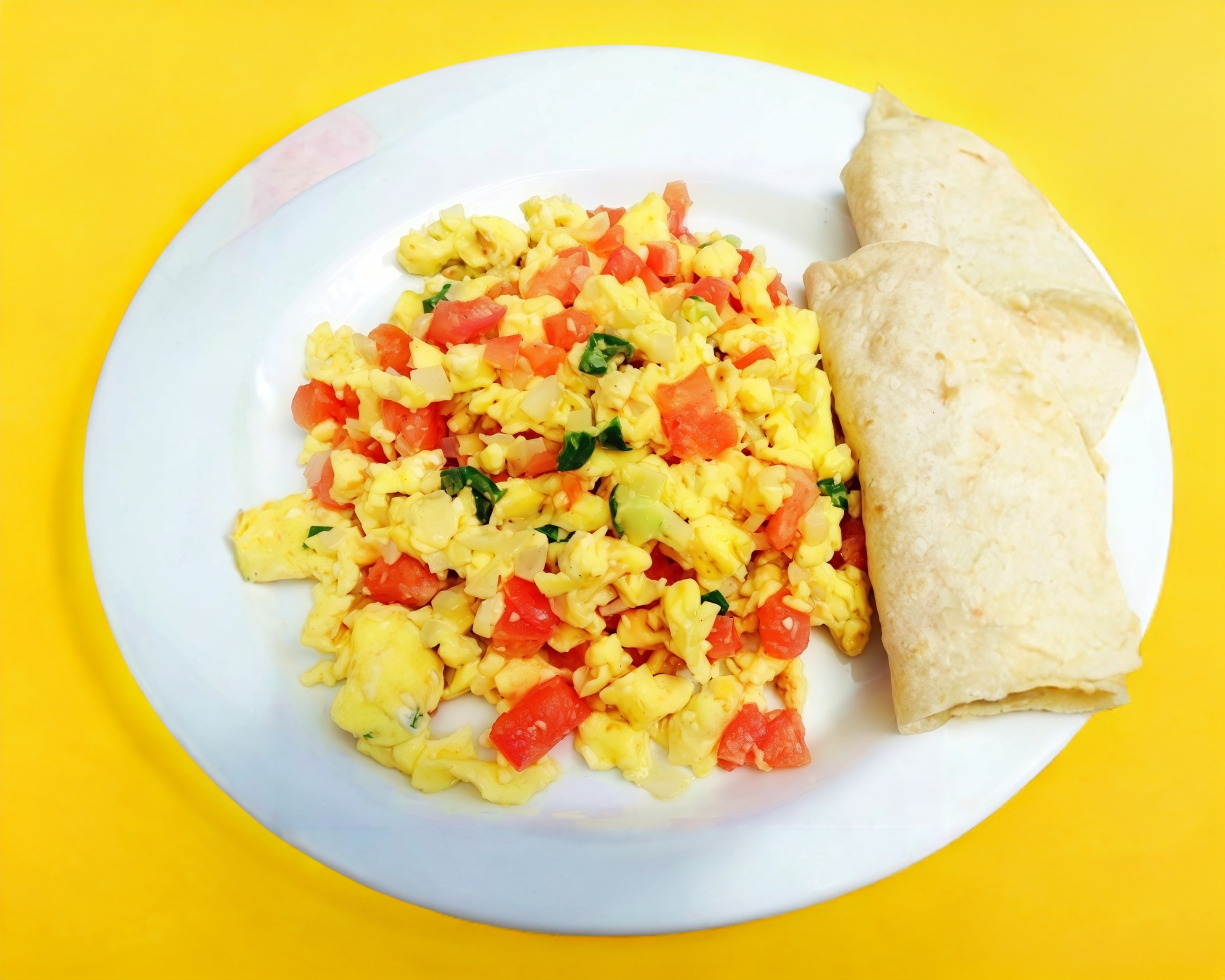 Huevo revuelto con chile, tomate y cebolla, incluye papas sazonadas y frijoles refritos, 3 piezas de tortilla de maiz.
