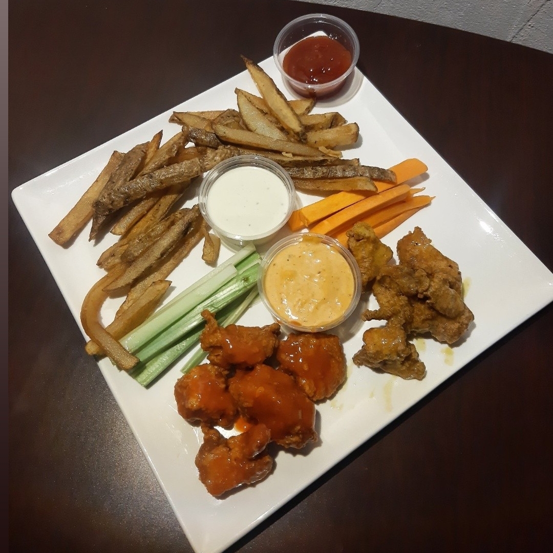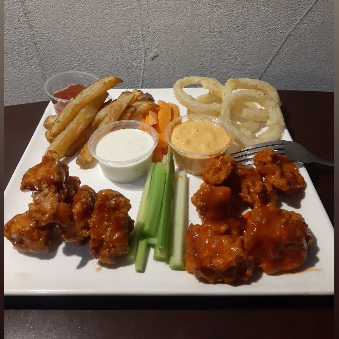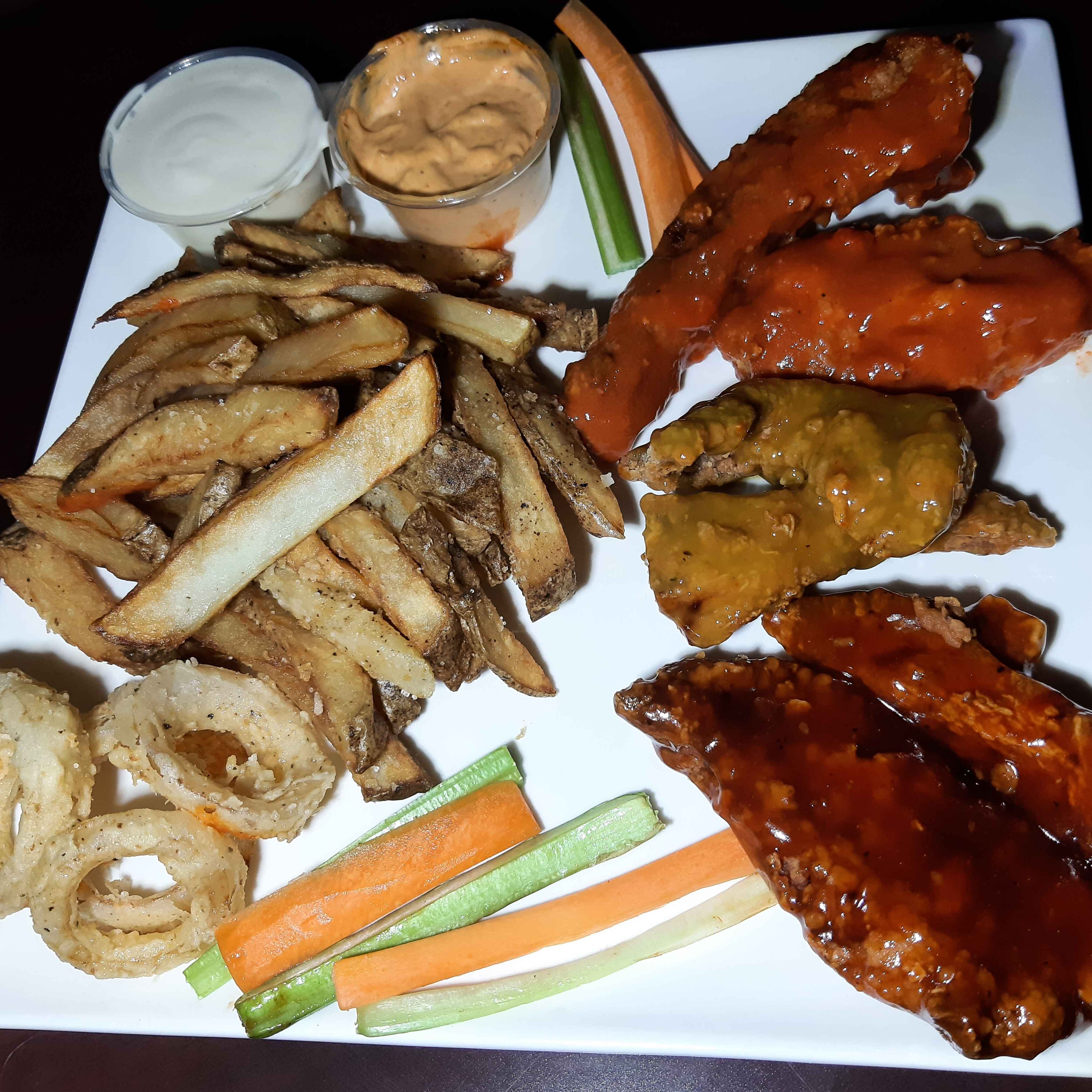 8 pzs de pechuga de pollo bañadas en tus salsas favoritas Bbq Red hot y Mango habanero, acompañado de papas , aros de cebolla y aderezo