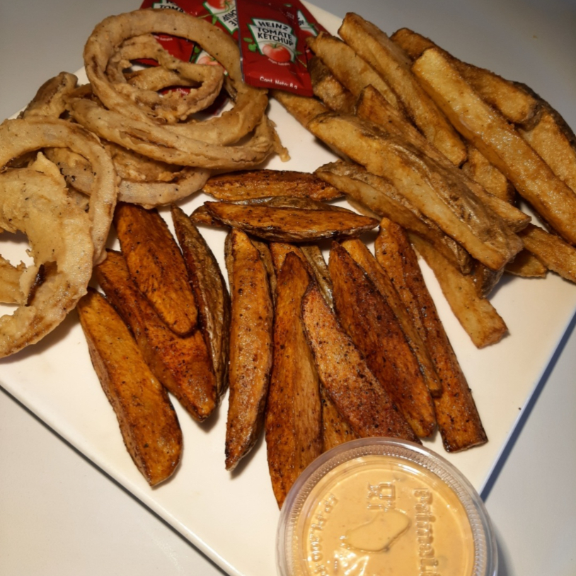 Combo botanero papas a la francesa, aros de cebolla y papas gajo sazonadas incluye aderezo chiplotle