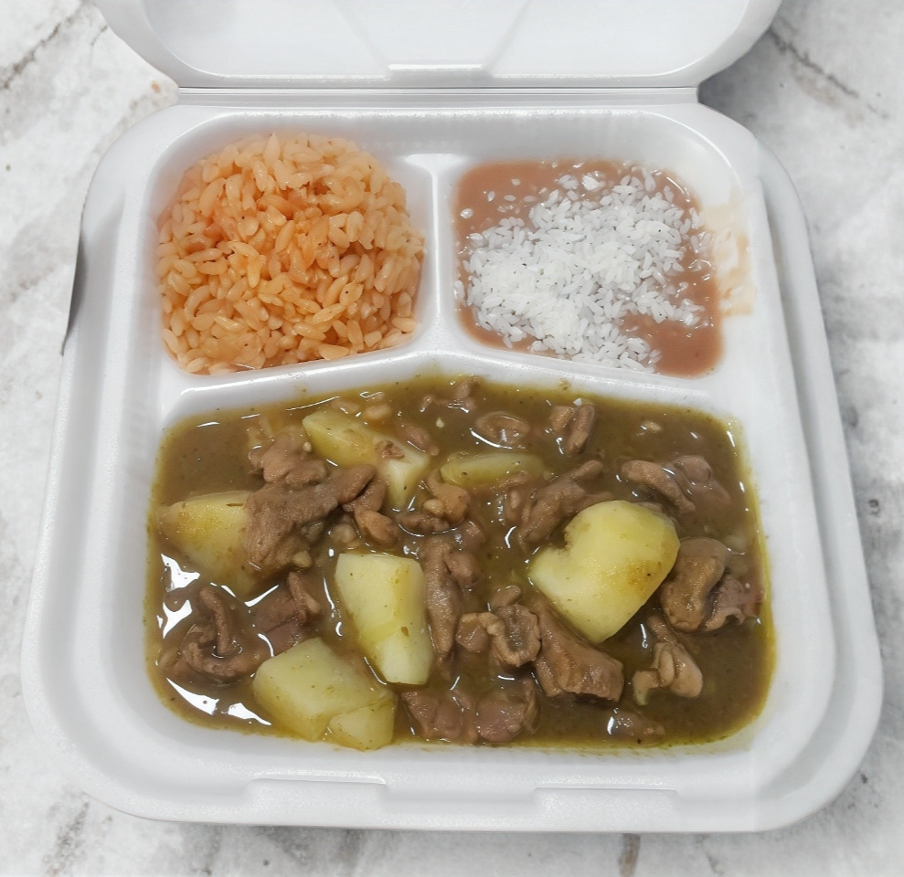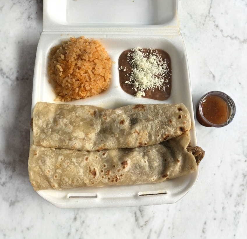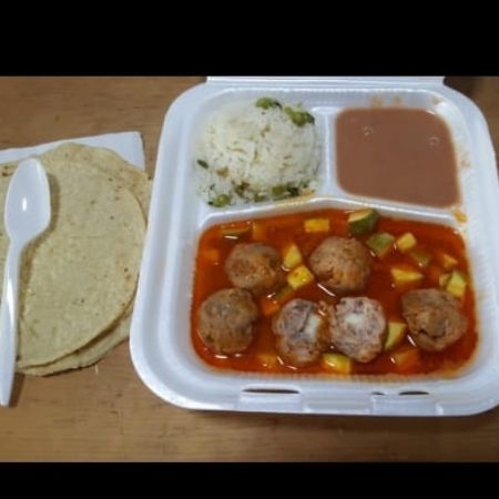 Acompañado con frijoles refritos, arroz a la mantequilla, tortillas y salsa casera