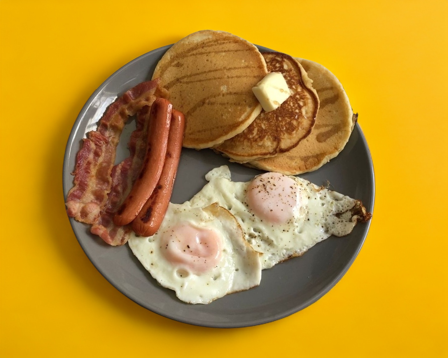 3 hotcakes, 2 huevos (a elegir, estrellados o revueltos) tocino,salchicha o jamon, mantequilla, miel.