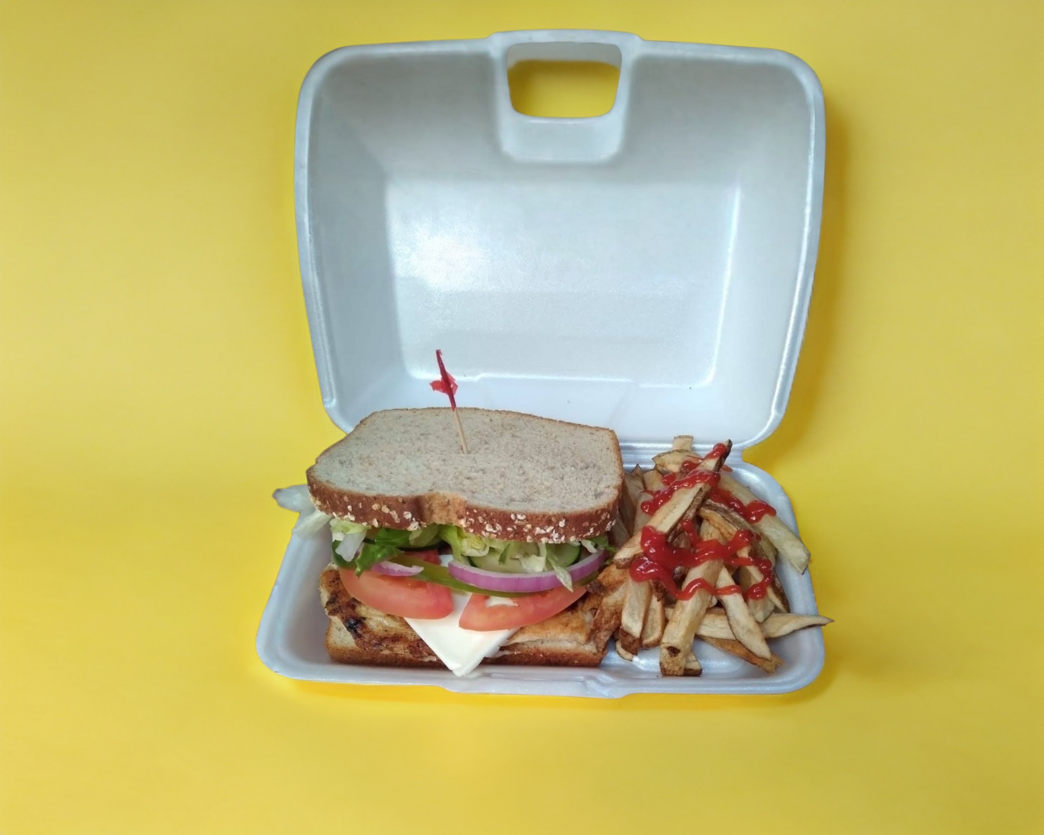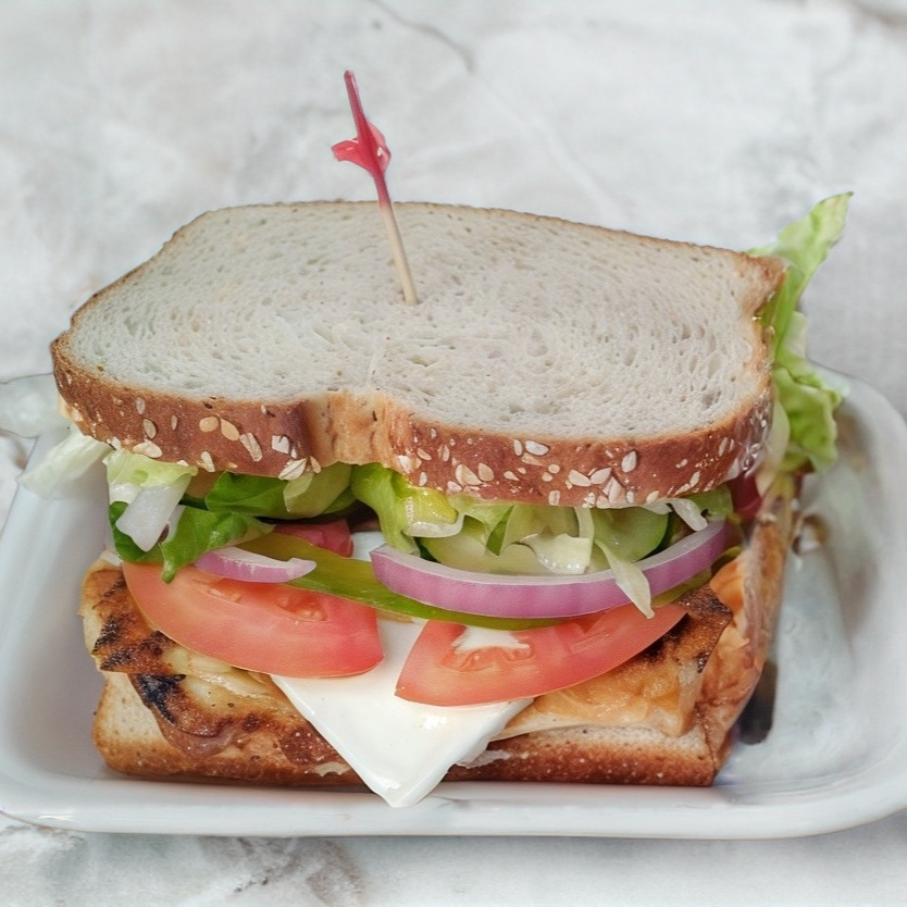Sandwich de pechuga de pollo, tomate,lechuga, queso, cebolla morada, papas sazonadas l horno o ensalada de papa con tocino , aderezo chipotle, catsup