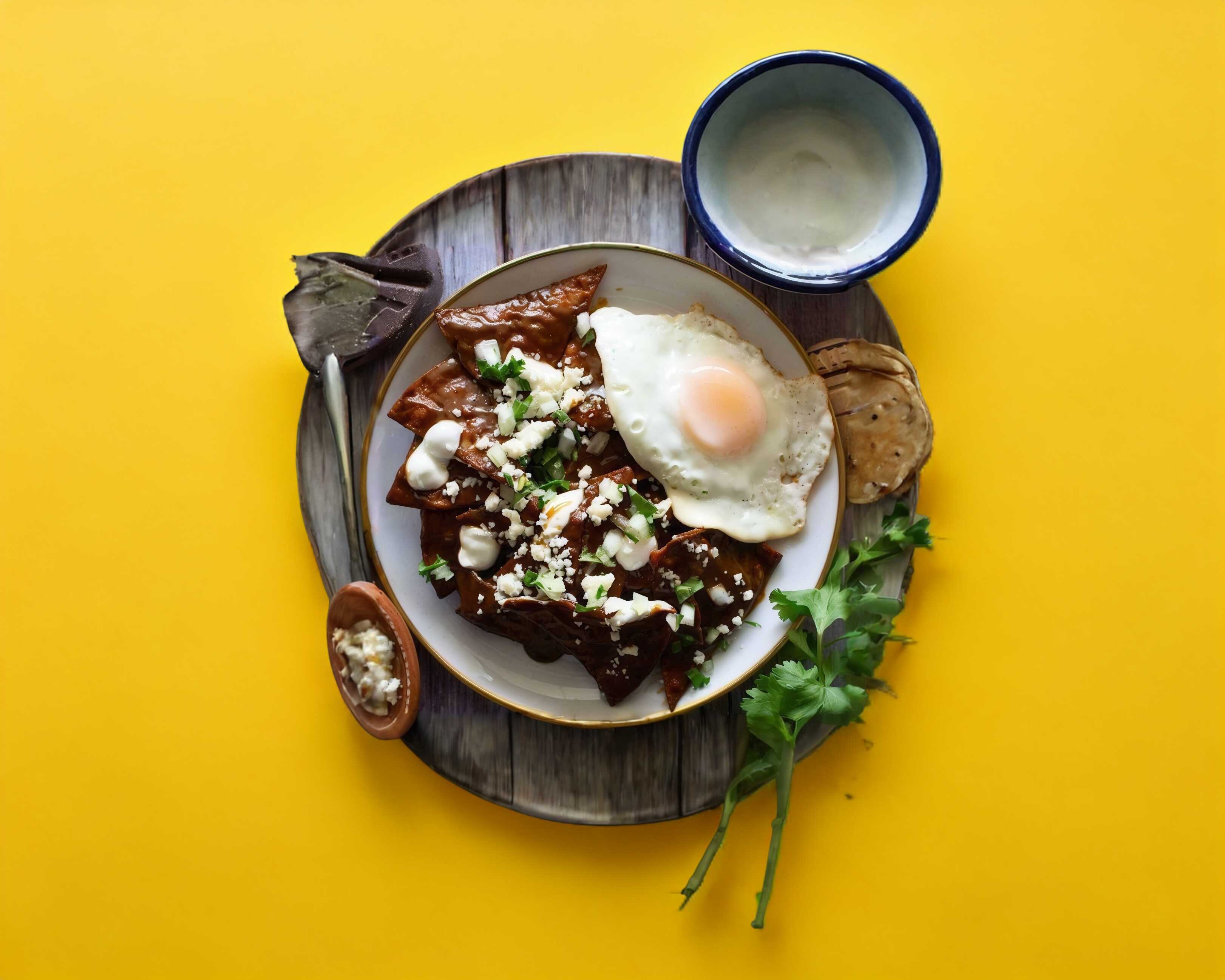 Chilaquiles de mole (,crema, queso, cebolla,cilantro) 2 huevos al gusto, frijoles refritos, salsa casera.