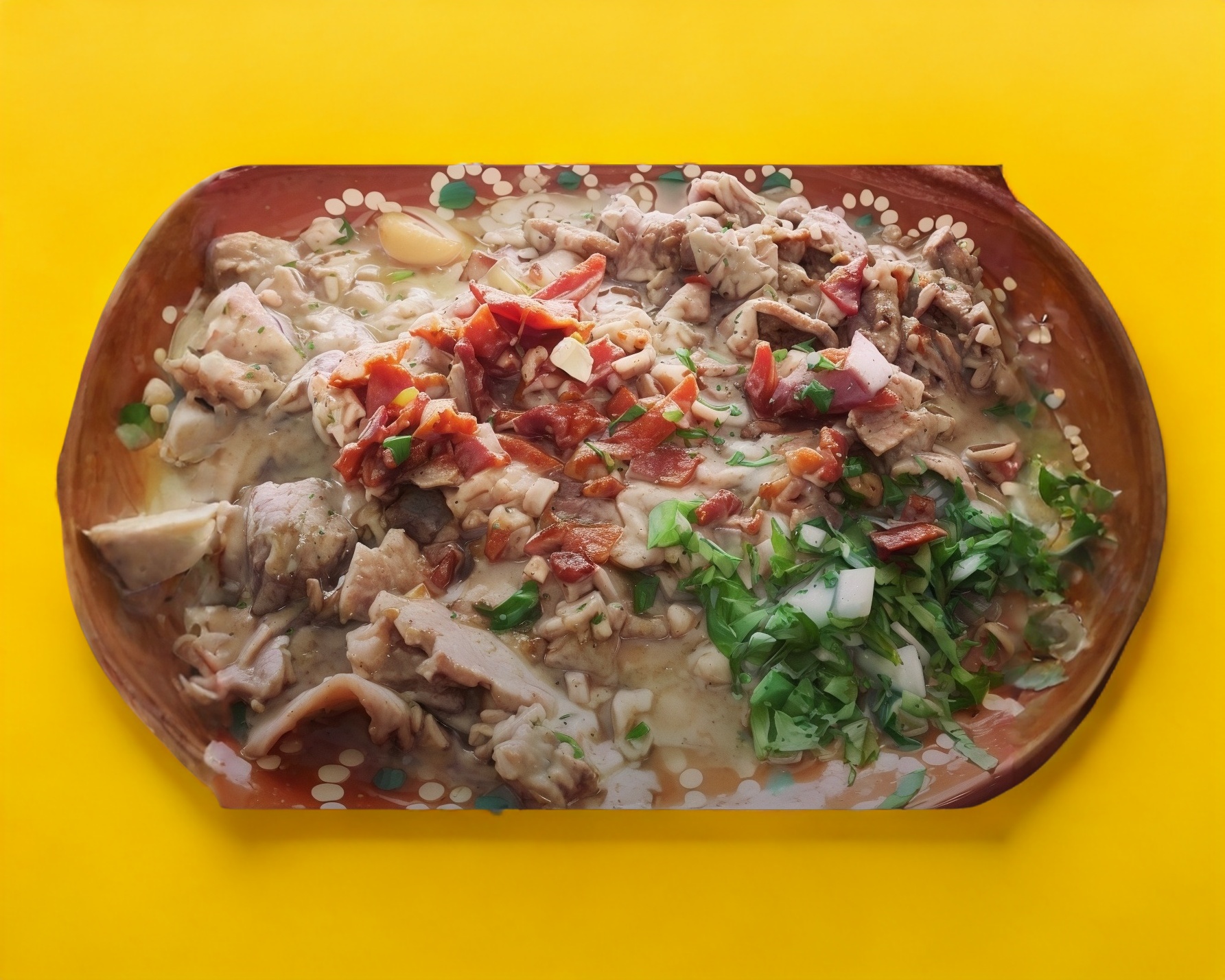 Acompañado de frijoles refritos con queso, arroz rojo, tortillas y salsa casera