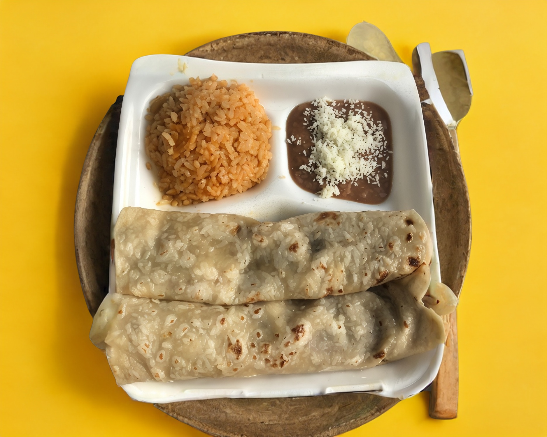 Con frijoles refritos, arroz rojo salsa casera