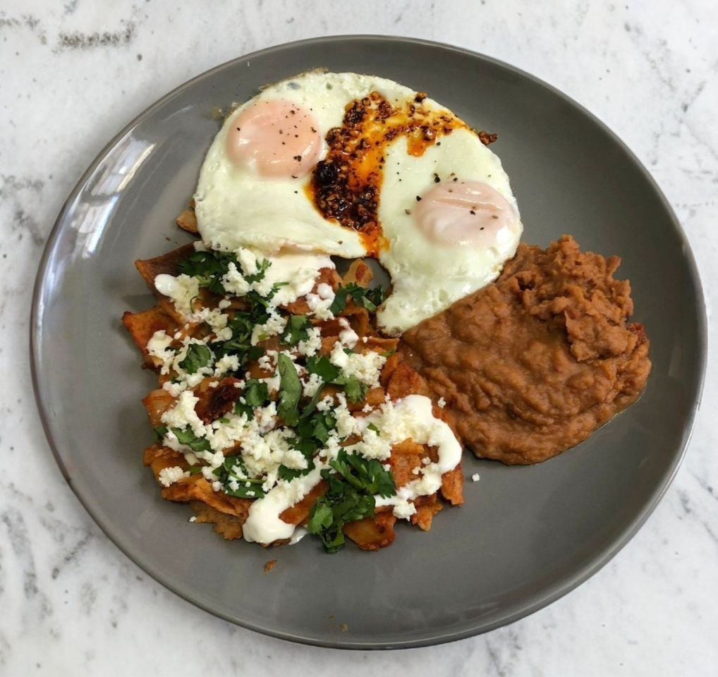 2 huevos (estrellados o revueltos), chilaquiles con crema, queso, clantro, cebolla, frijoles refritos.,salsa casera..