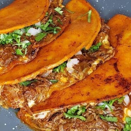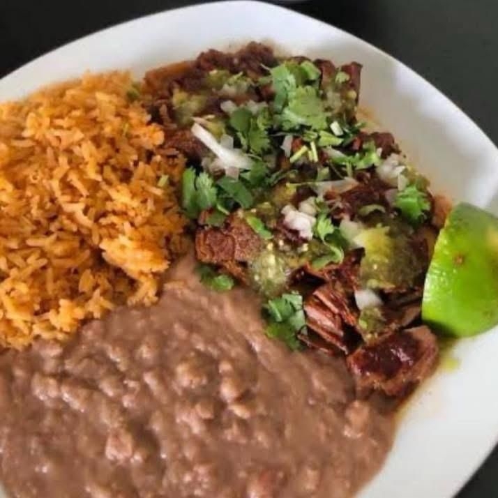 3 Quesadillas con birria, frijoles con chorizo, arroz rojo, salsa casera, cilantro y cebolla, limón