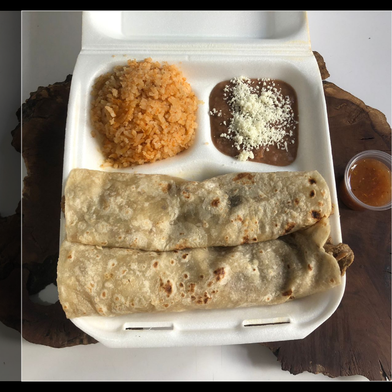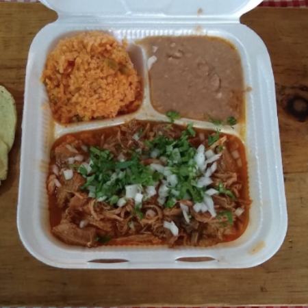 Acompañado de Arroz rojo, frijoles.refrito con chorizo, cilantro y cebolla, salsa casera tatemada y limón