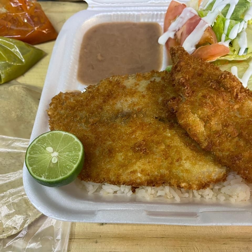 Pescado Empanizado acompañado de cama de arroz ala mantequilla, frijoles refritos, ensalada mixta,aderezo, salsa casera, limón, tortillas