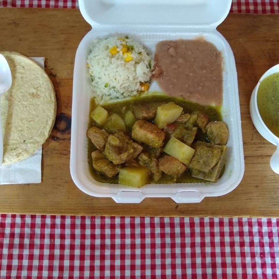 A elegir con papá o Nopales, acompañado de frijoles refritos, arroz al mantrcon elote, salsa casera tatemada, tortillas