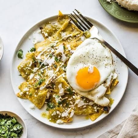 Chilaquiles verdes con crema, queso, cebolla cilantro, Acompañados de huevos al gusto y frijoles refritos, salsa casera
