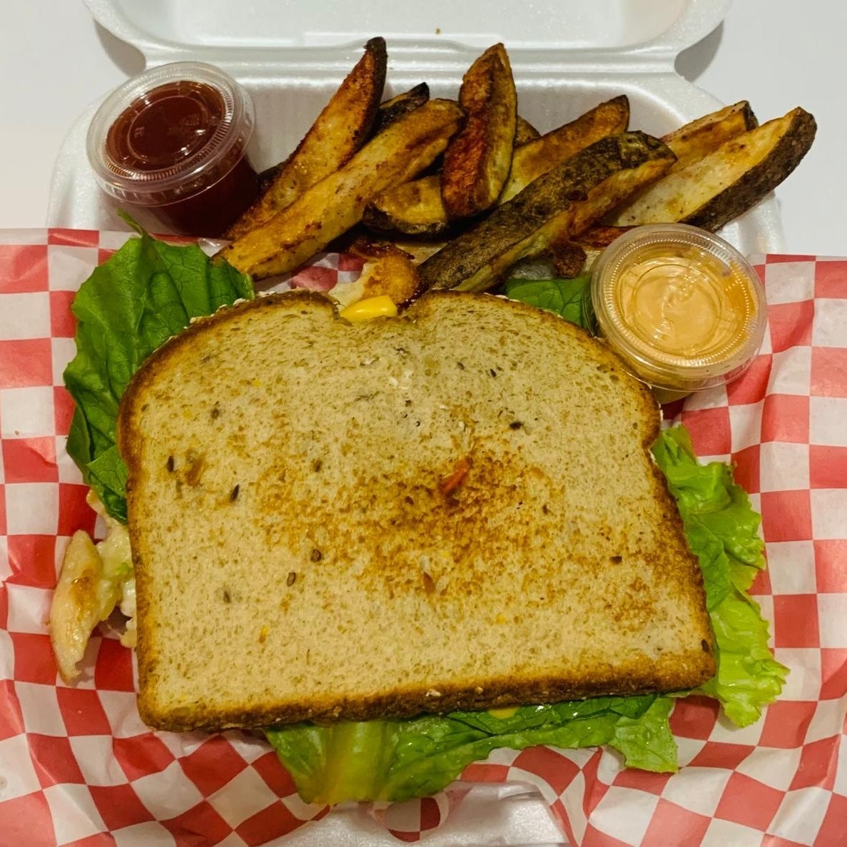 Sandwich de pechuga de pollo, tomate,lechuga, cebolla, pimiento verde, pepino, papas sazonadas al horno , adrezo rosa de pepinillo, catsup