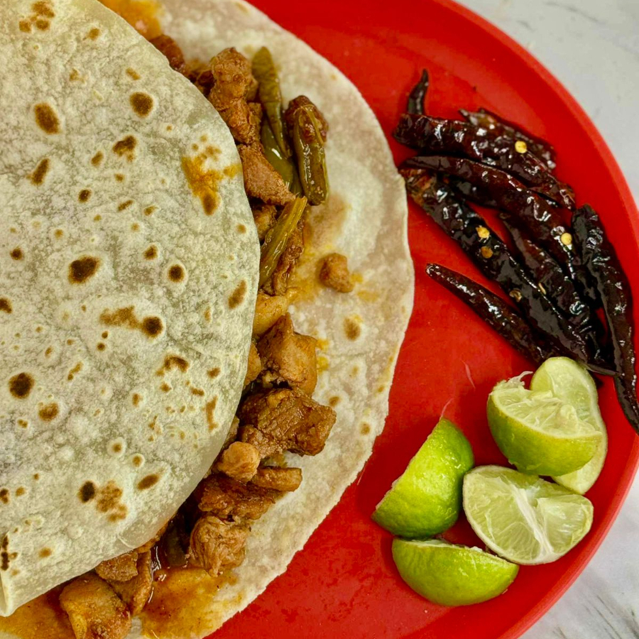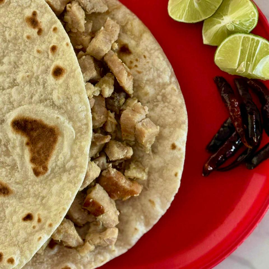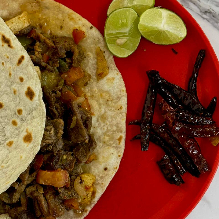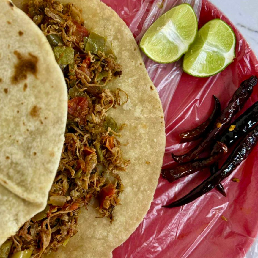 3 tacos de carne deshebrada, lechuga, tomate, aguacate y queso cotija c/frijoles.