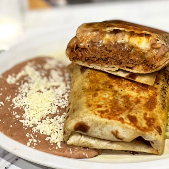 Chimichanga de res con queso, lechuga, tomate, aguacate y queso Cotija.