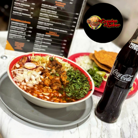 Pozole rojo, con pata de puerco, carne y espinazo.