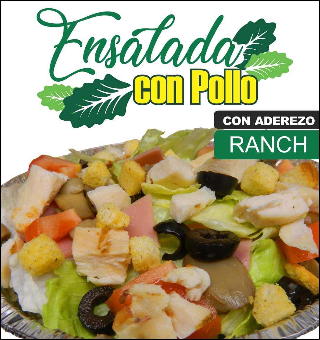 Lechuga fresca con jamón, pepperoncini, tomate fresco, aceituna negra, champiñones, croutones y pollo, acompañada con aderezo ranch.