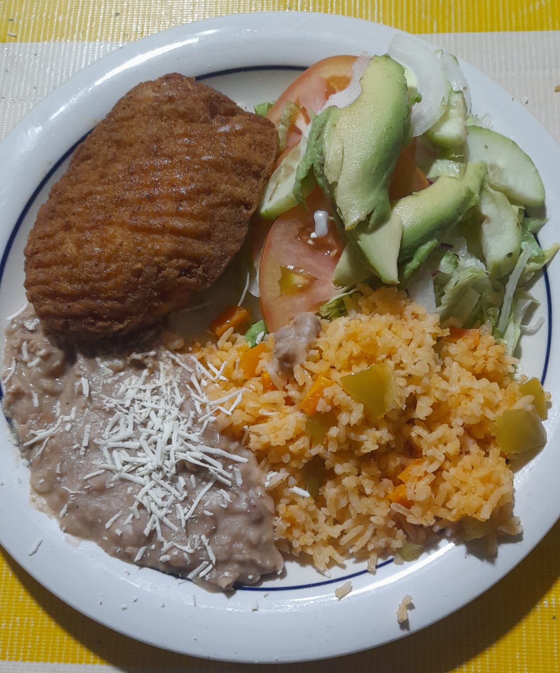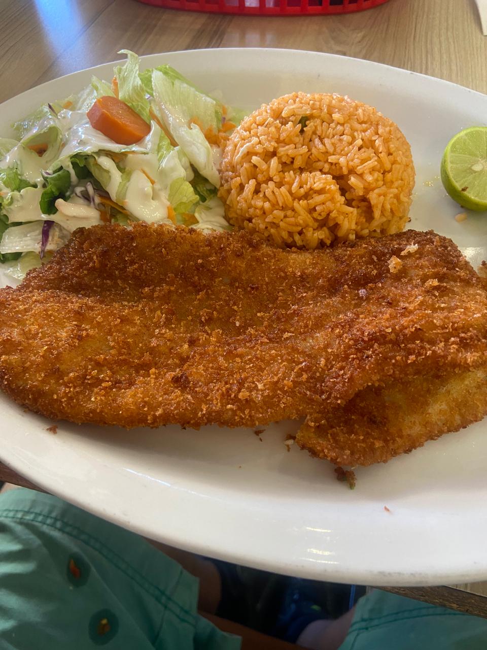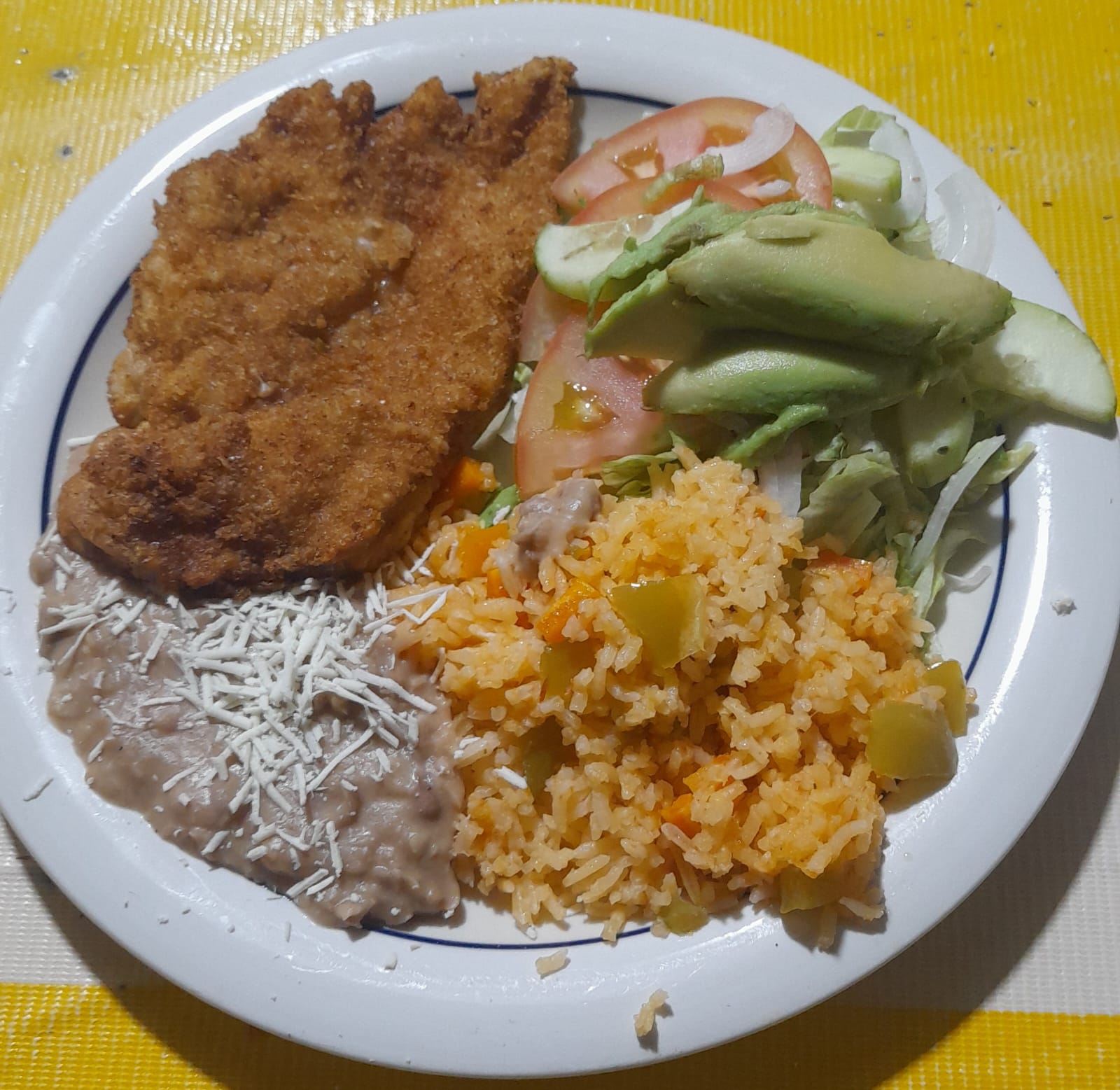 Pechuga de pollo empanizada y frita hasta quedar crujiente.