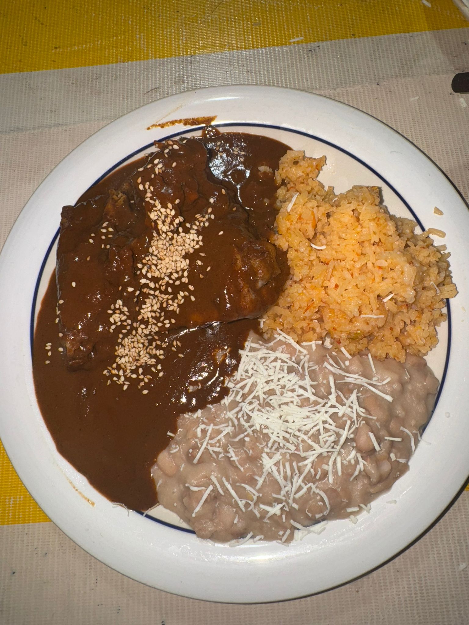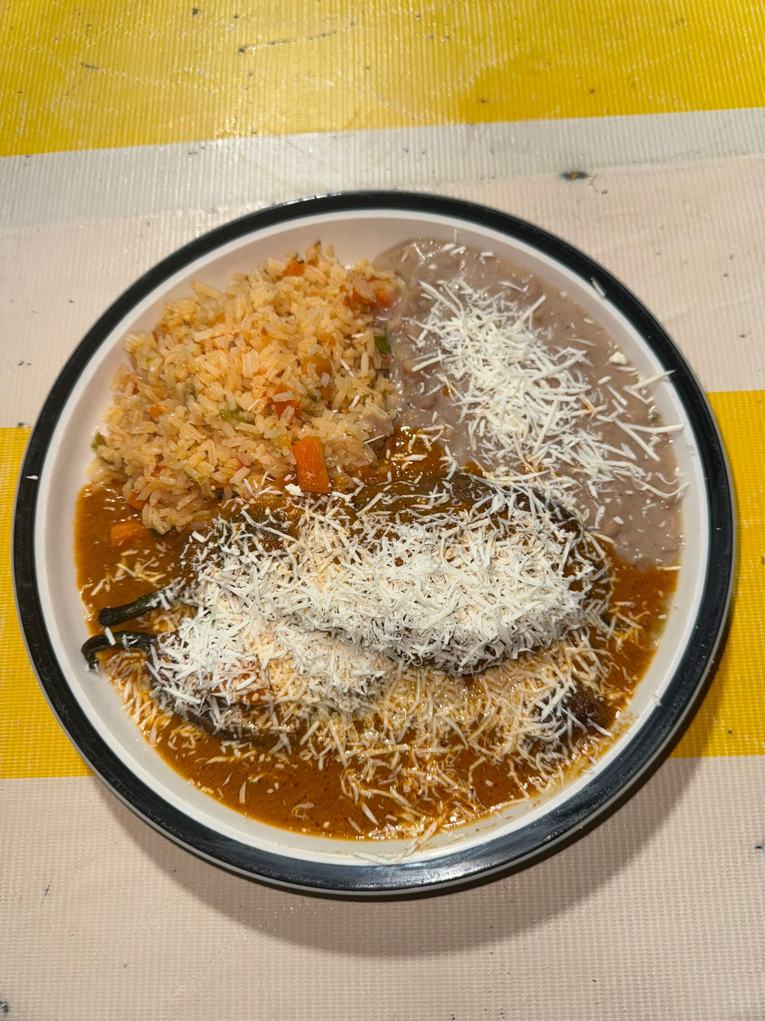 Chiles poblanos rellenos de queso o carne, capeados y bañados en salsa.