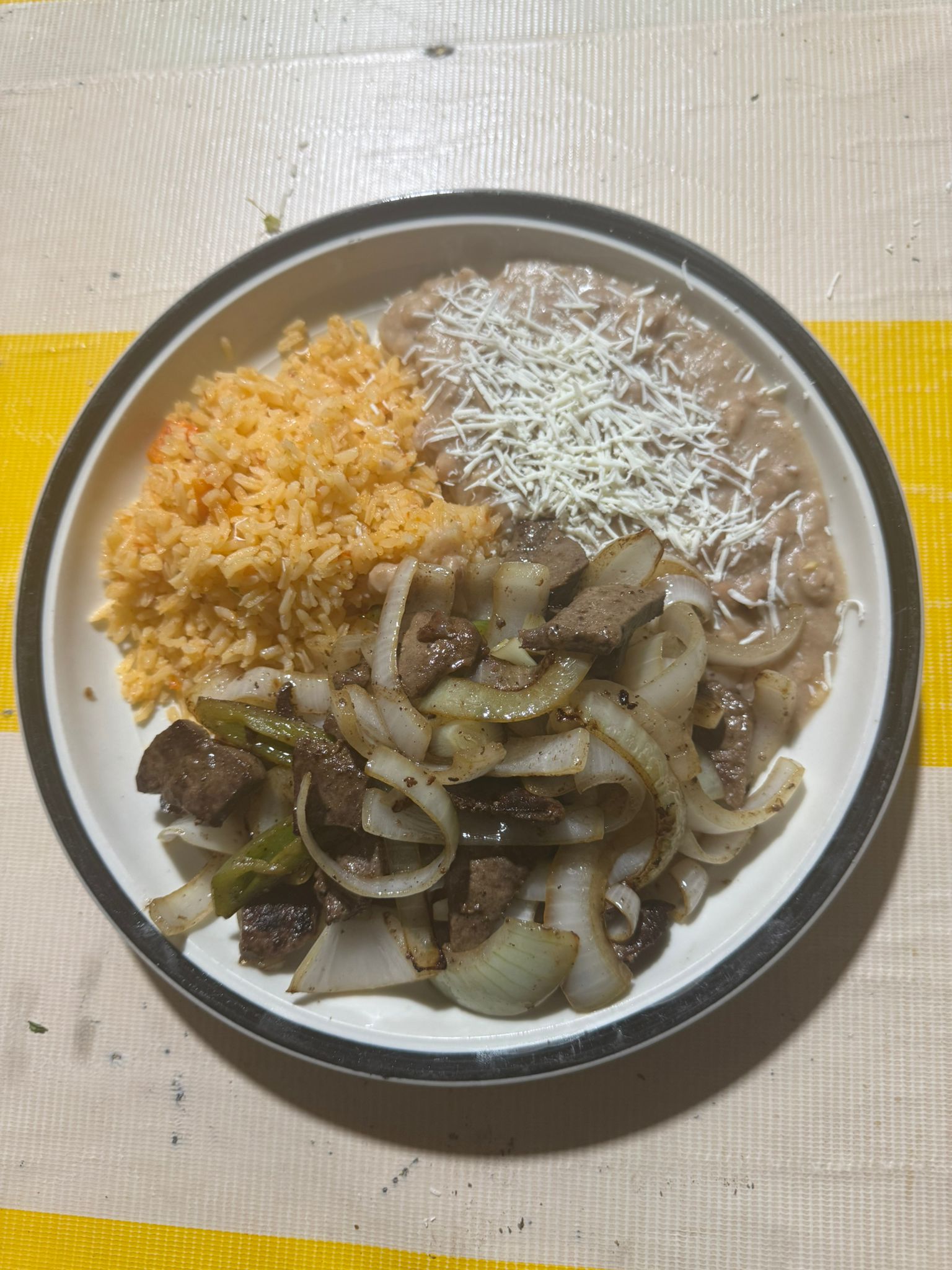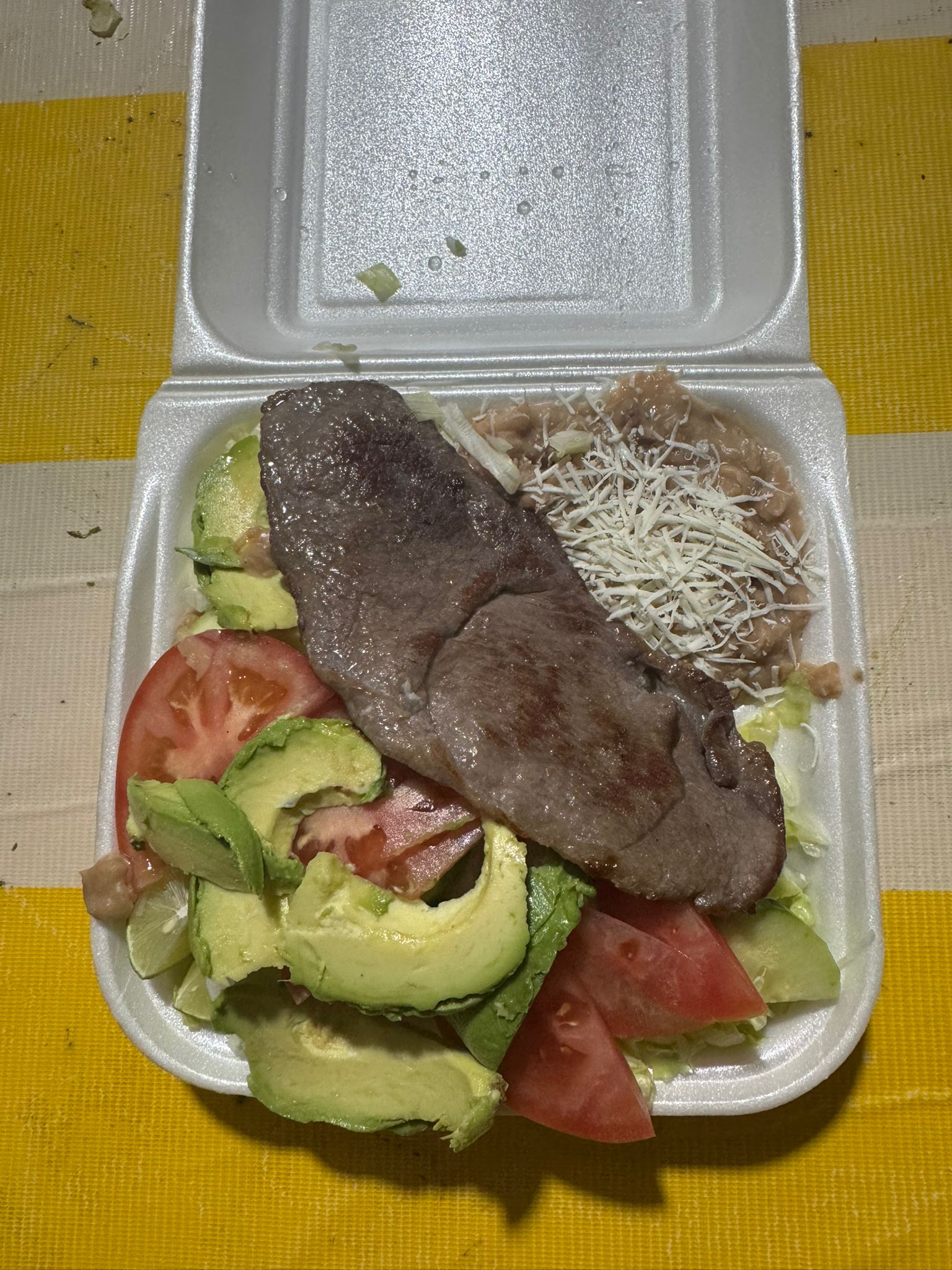 Bistec de res guisado a la ranchera con tomate, cebolla y chiles.