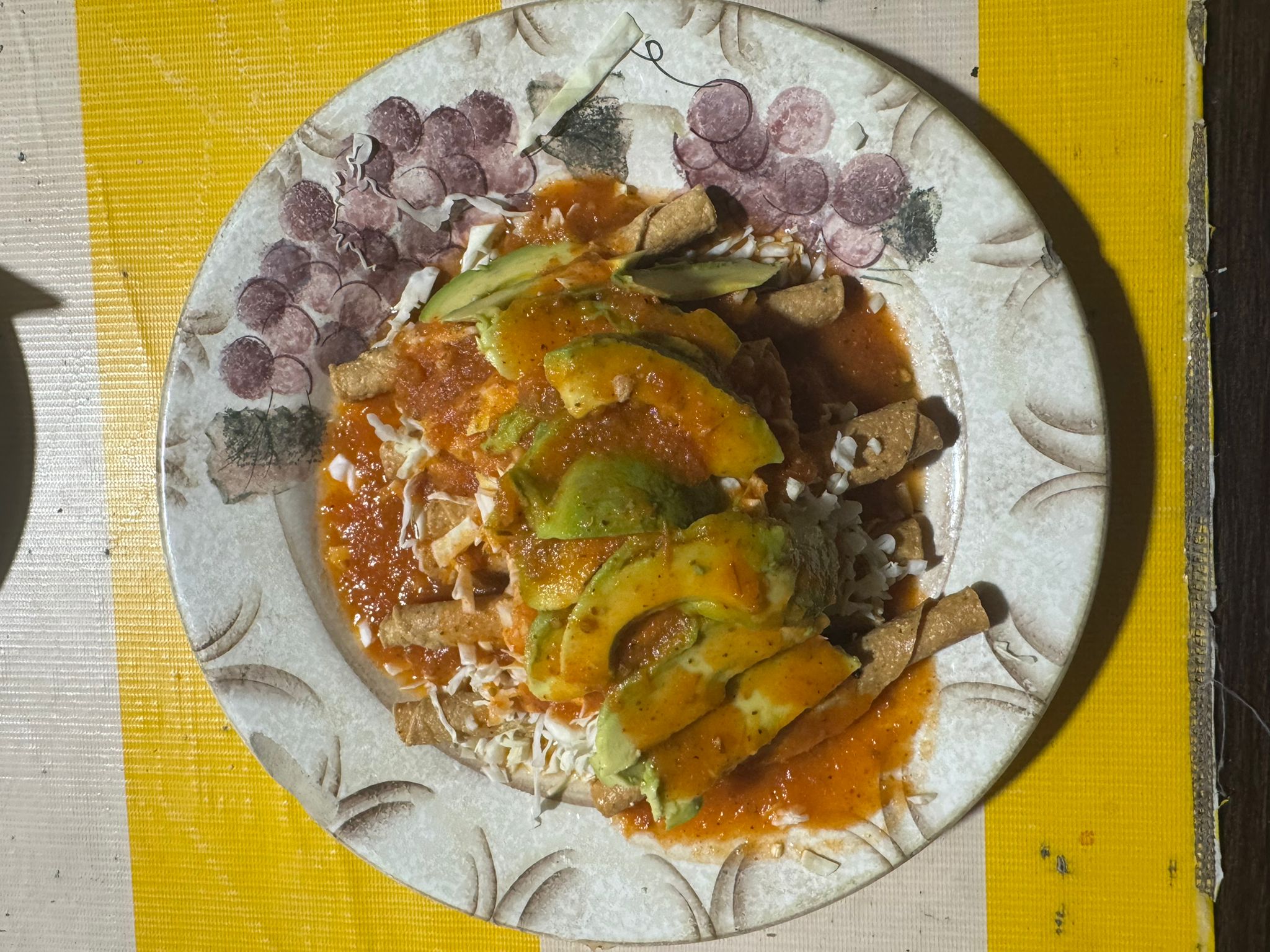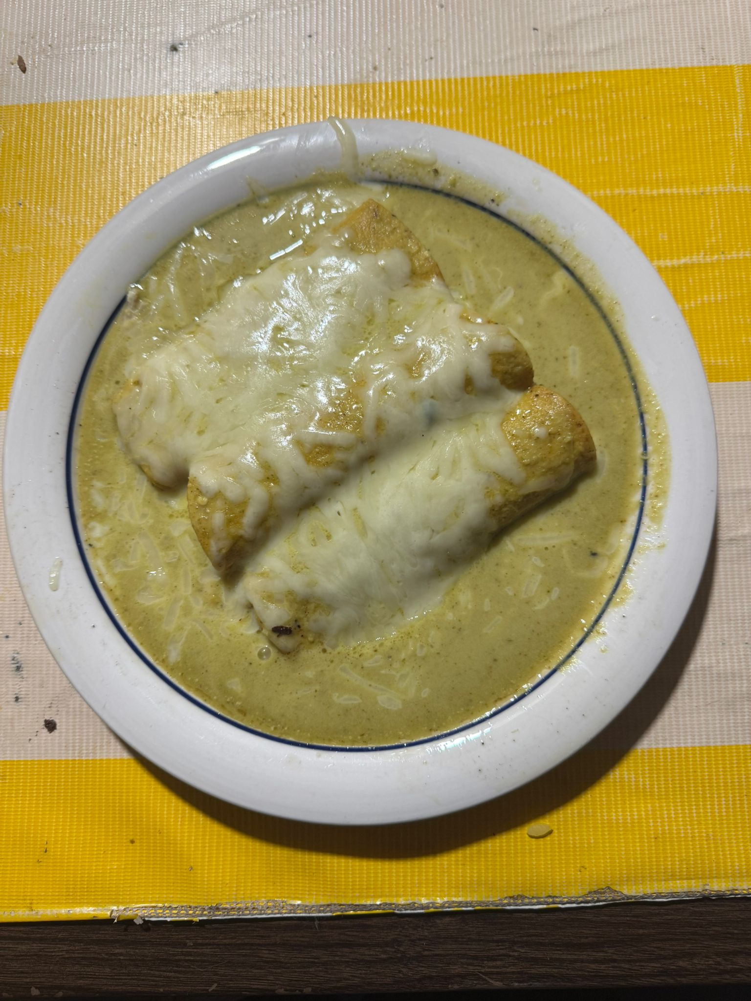 Enchiladas de pollo en salsa verde cremosa, gratinadas con queso.