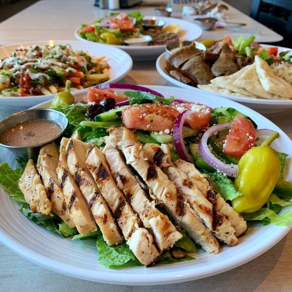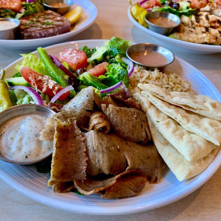 Proteína de tu Elección: Servida con Arroz Pilaf, Pan, Pita, Ensalada Griega, Acompañado de Vinagreta y Tzatziki