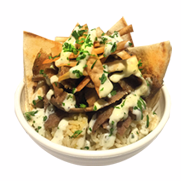 Cama de Nuestro Exquisito Arroz Pilaf Seguido de tu Proteína Favorita. Acompañado de Pan Pita Calientito, Pitachips y Tzatziki.