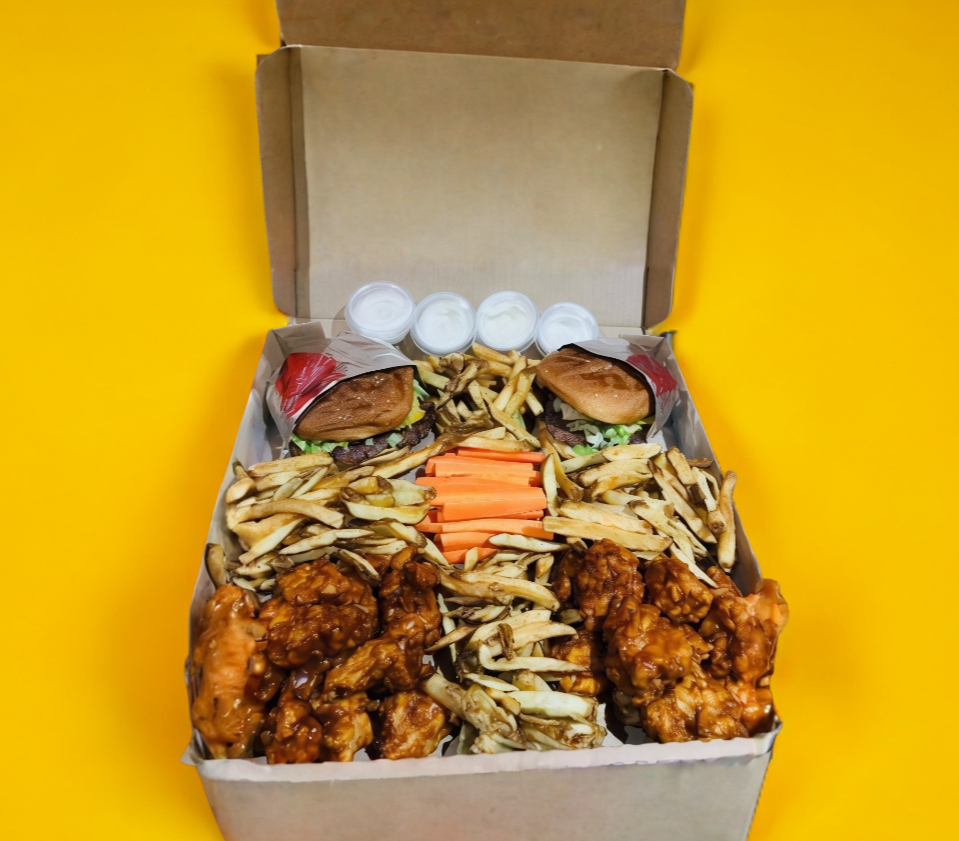 2 Hamburguesas de res preparadas en casa, 20 boneless, papas naturales, apio, zanahoria, 4 aderezos ranch.