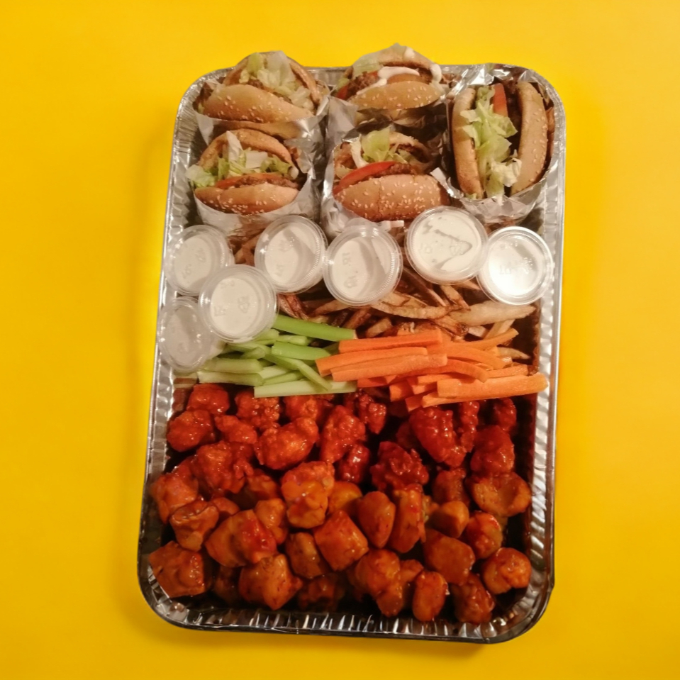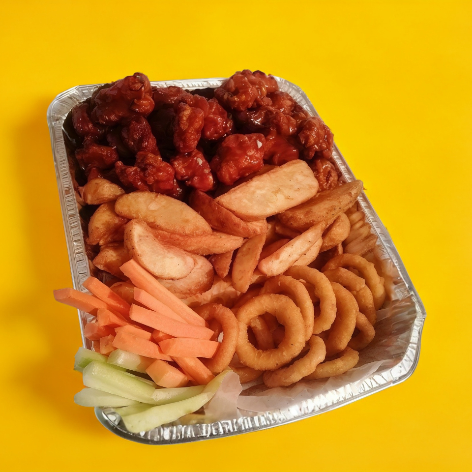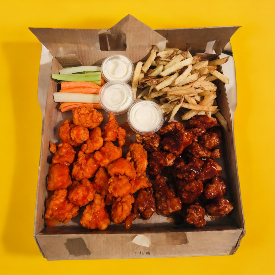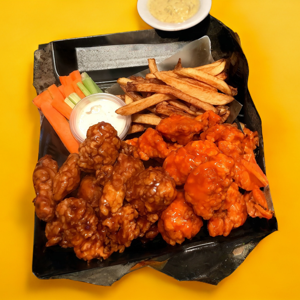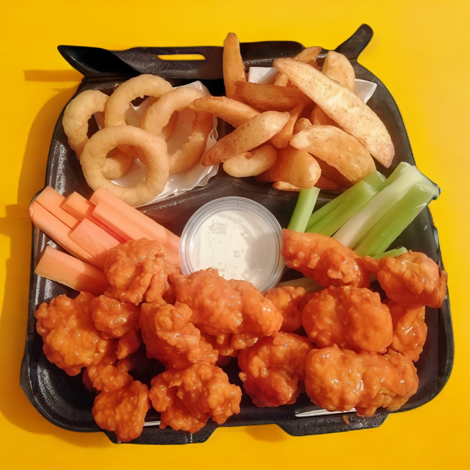 50 boneless, papas sazonadas, aros de cebolla, apio, zanahoria, 4 aderezos ranch.