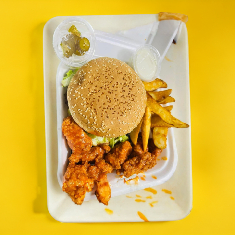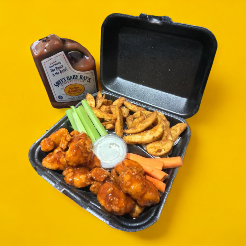 300 gramos de pechuga empanizada bañados en deliciosa salsa mango-habanero, papas sazonadas,aros de cebolla, apio, zanahoria y 1 aderezo ranch.