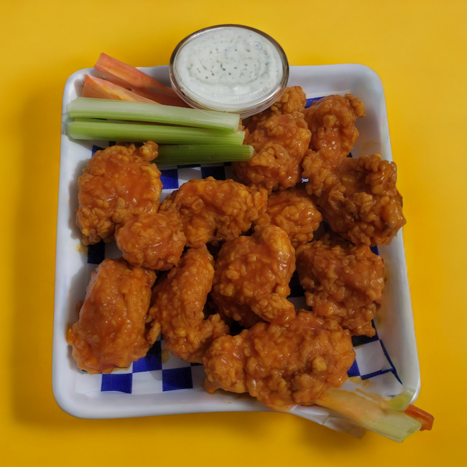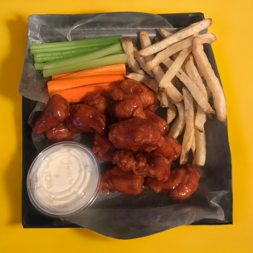 Lleva 12 piezas de boneless recien preparados, apio, zanahoria y un aderezo ranch