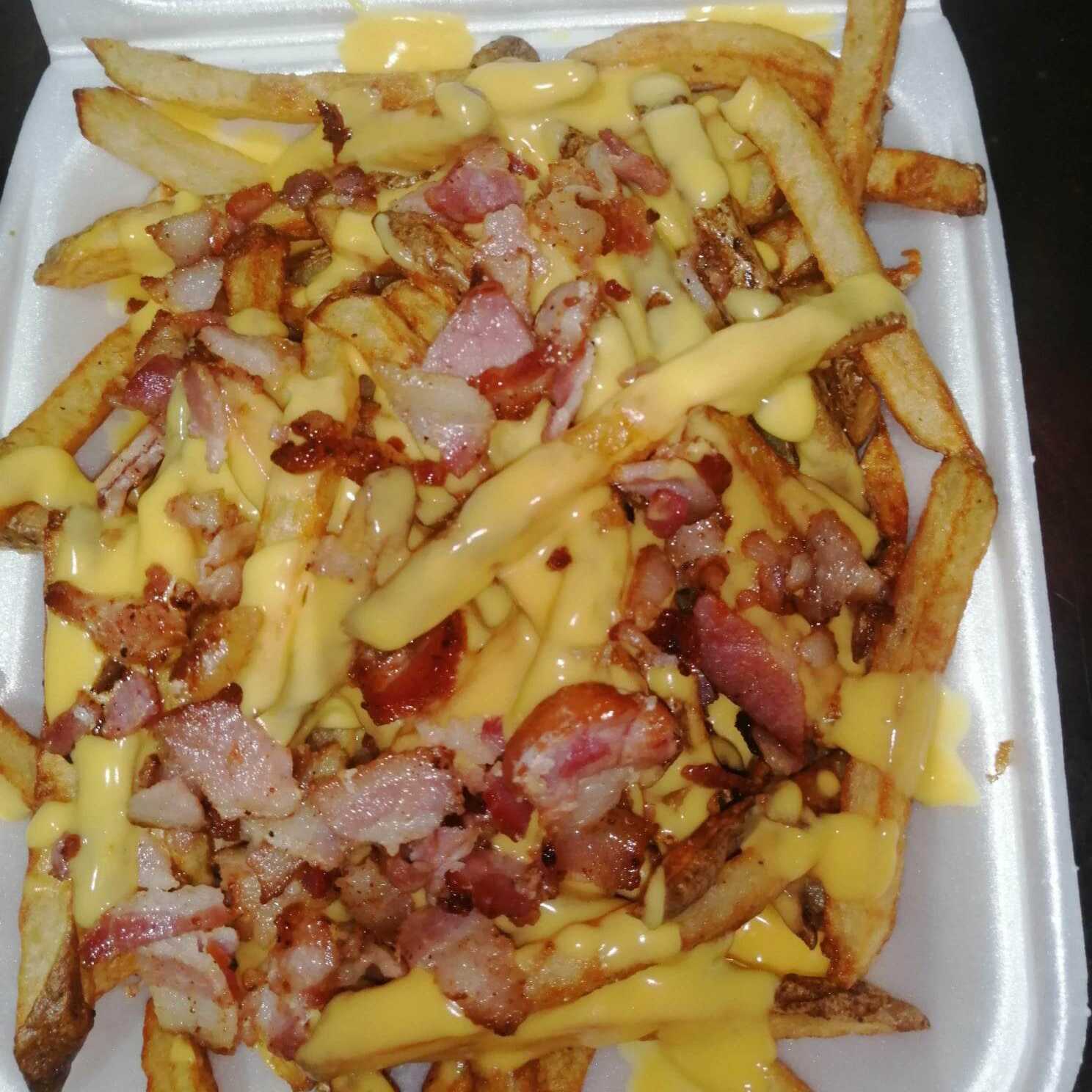 Lleva papas fritas naturales, delicioso tocino, queso de nachos.