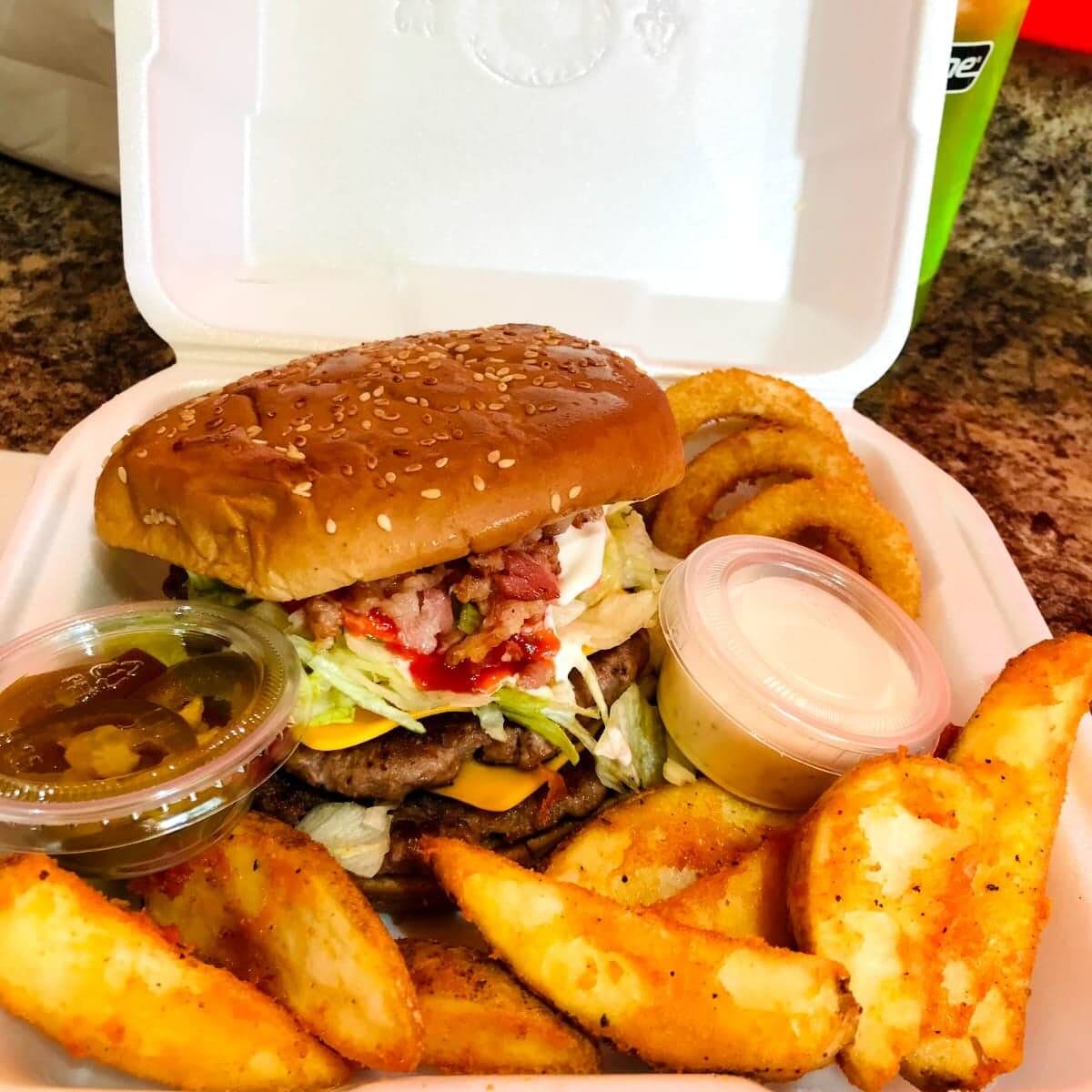 Doble carne, tocino, queso amarillo, aros de cebolla, papas sazonadas, aderezo ranch.