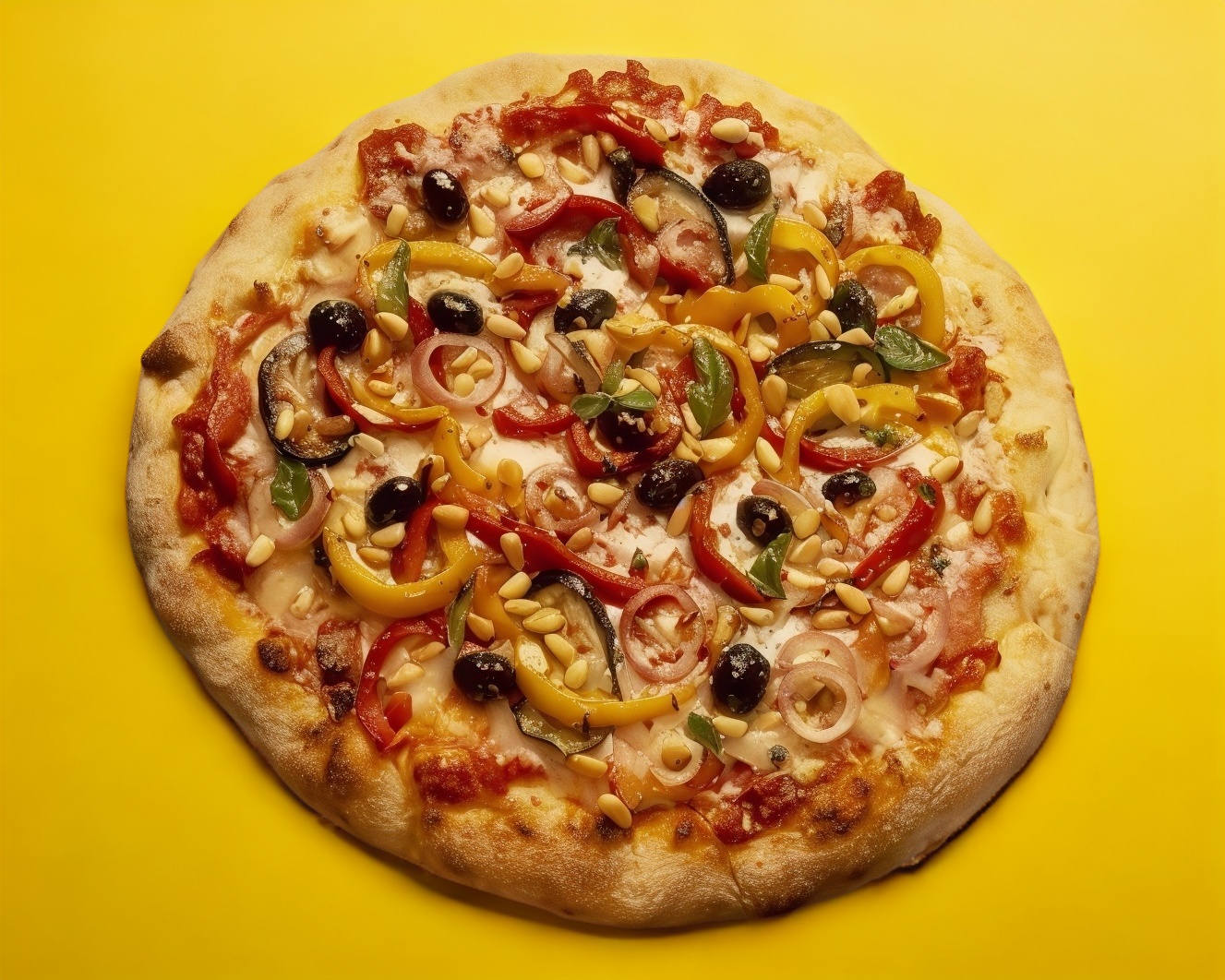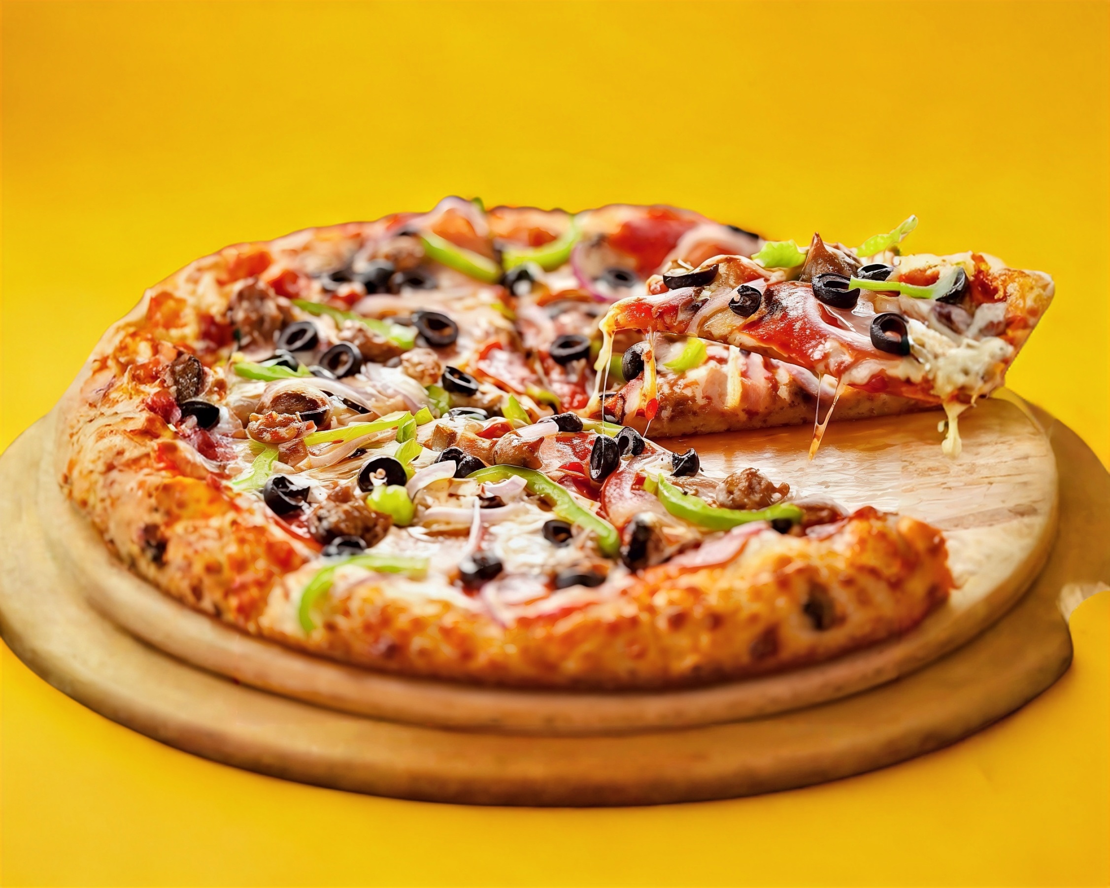 Pasta de tomate, queso mozarella, jamon de pavo, champiñones, aceituta negra y chile morron