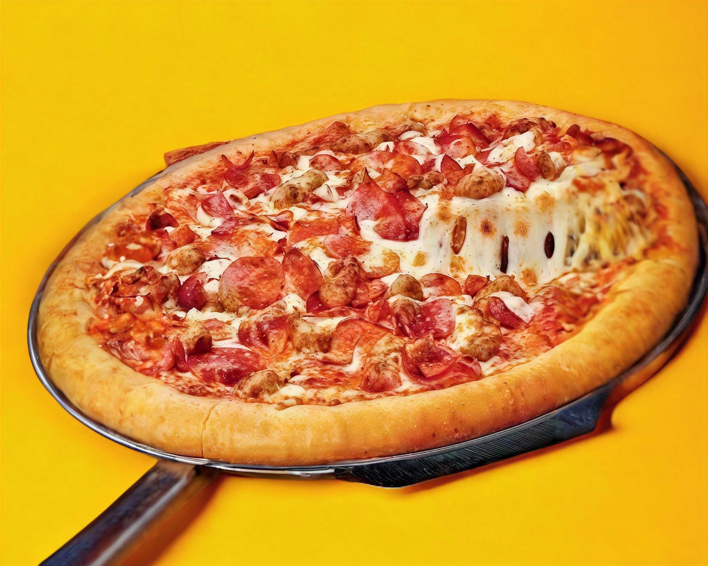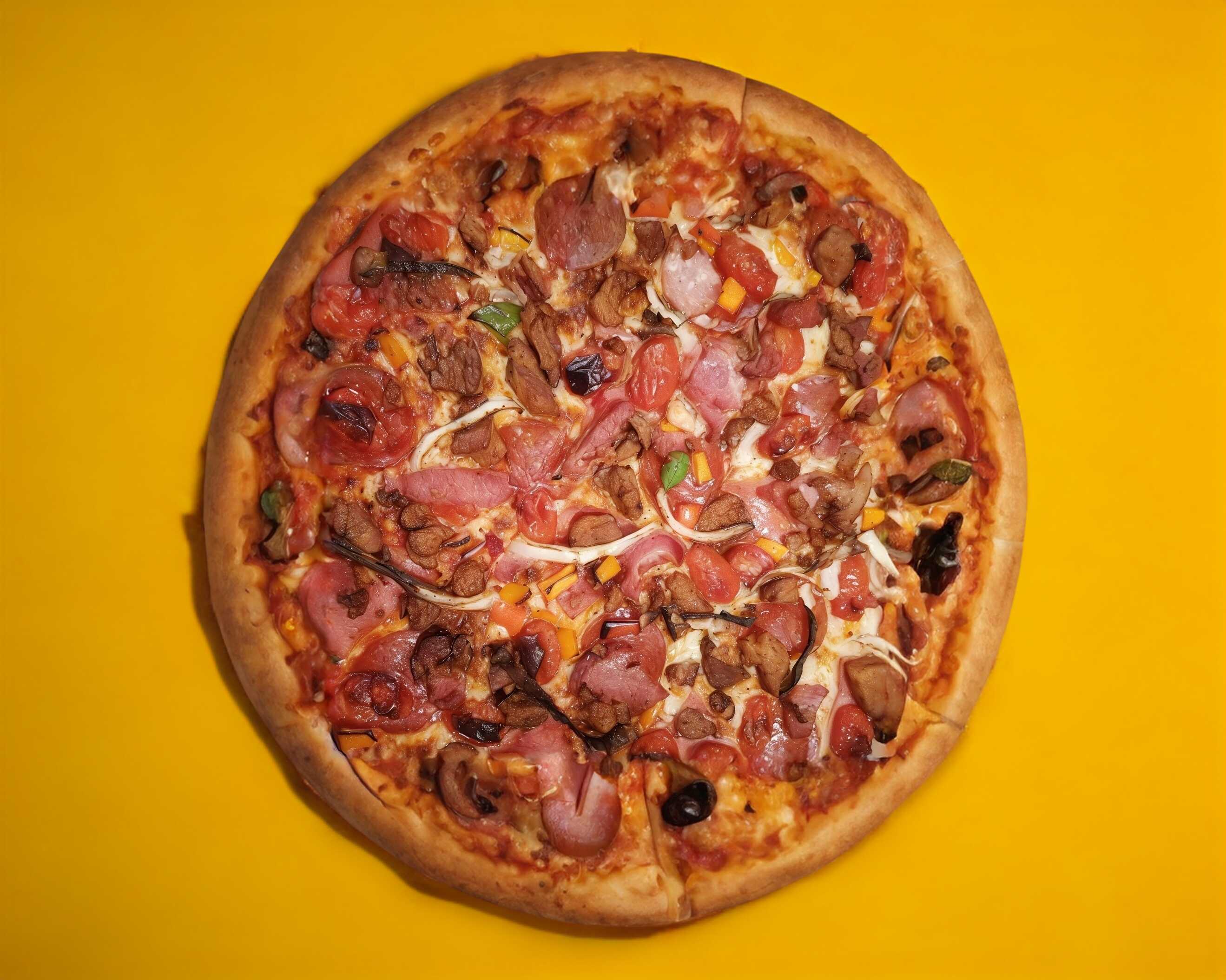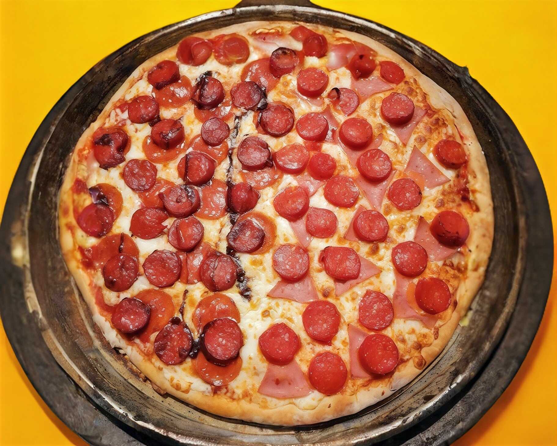 Pasta de tomate, queso mozarella, pepperoni, jamon de pavo, champiñones, aceituna negra, chile morron, y chorizo